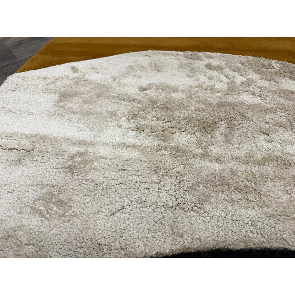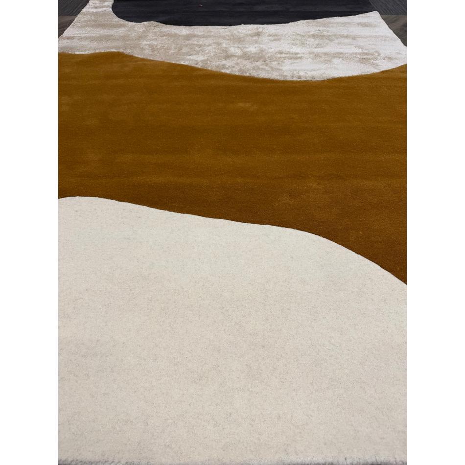 The Matrix MAX104 Signature Modern Geometric Rug showcases a minimalist abstract design defined by flowing curves in Burnt Ochre, Soft Off-White, Champagne Beige, and Deep Charcoal Black. Its hand-woven high-density wool-viscose construction ensures exceptional quality, blending natural wool softness with the silky sheen of viscose to achieve a dense, tactile surface with subtle tonal highlights.