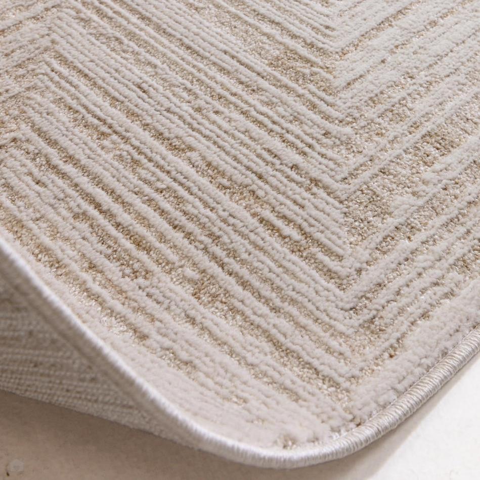 The Anders AN12 Cream, Warm Beige & Taupe Rug blends modern geometry with serene minimalism, featuring a subtle chevron-inspired linear pattern enhanced by a gently raised textured surface. The tonal interplay of light neutrals and warm undertones creates an inviting sense of calm, while the space-dyed yarns introduce delicate variation and a faint shimmer that shifts with the light.
