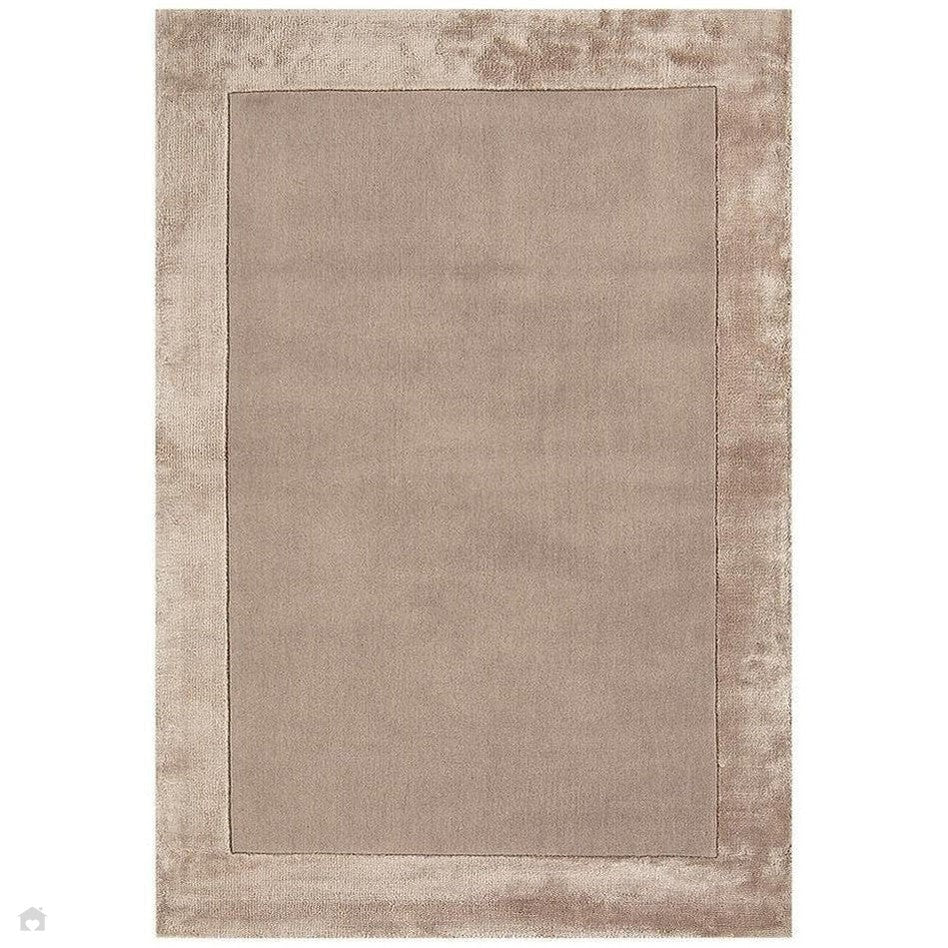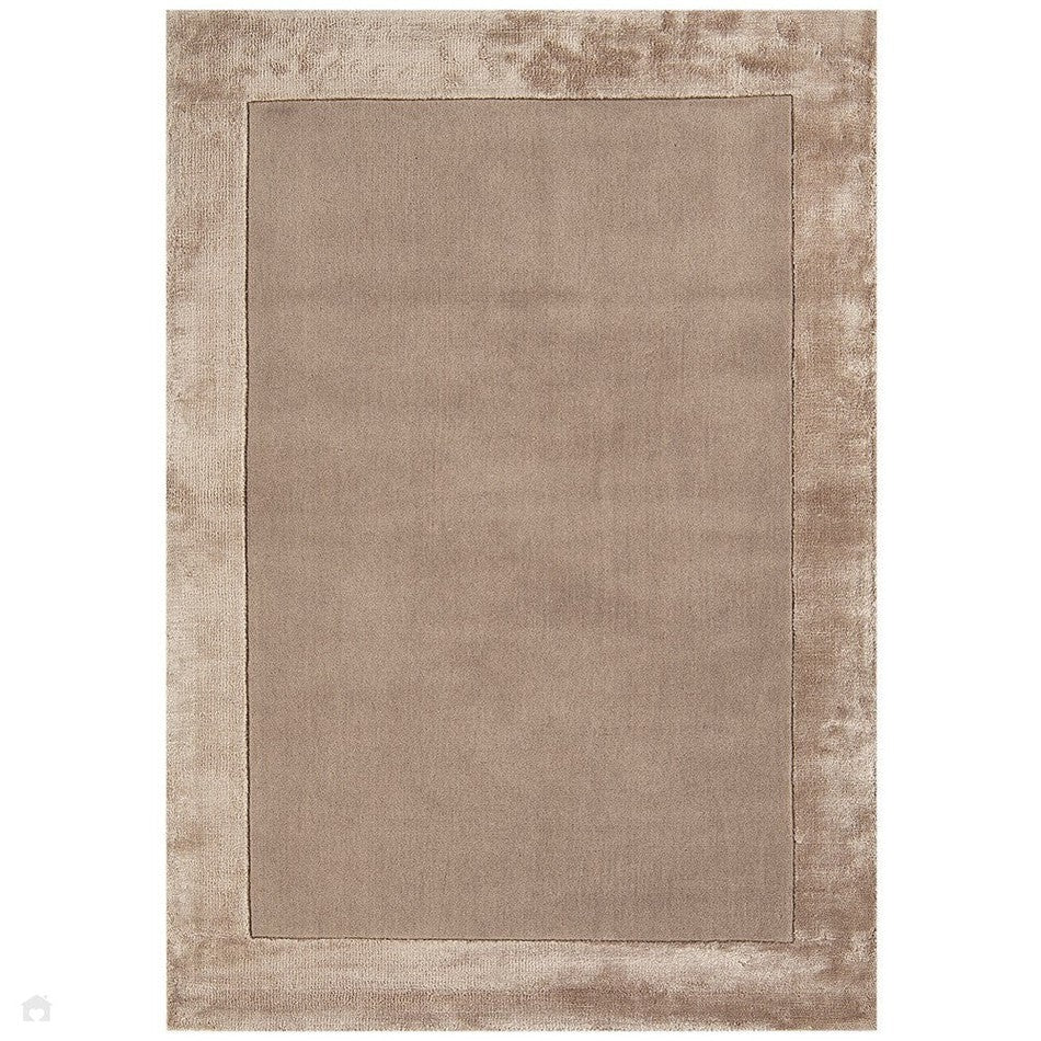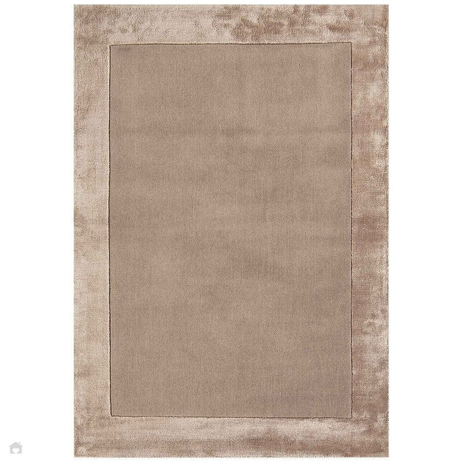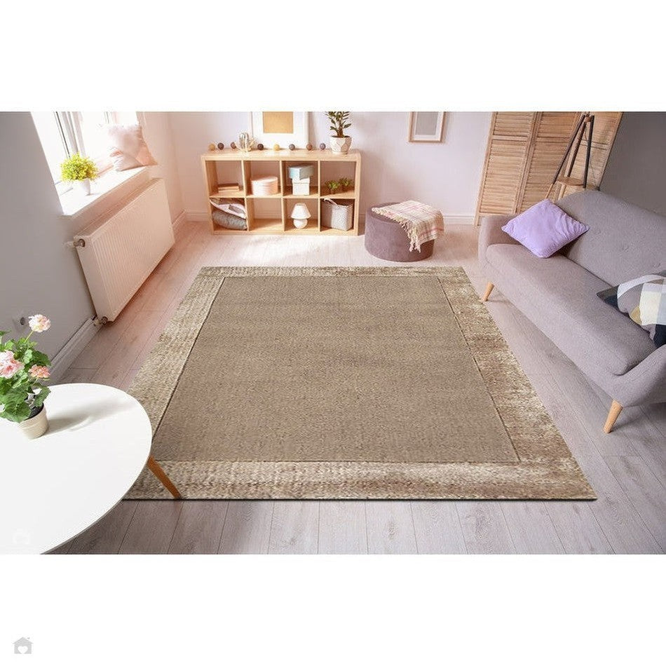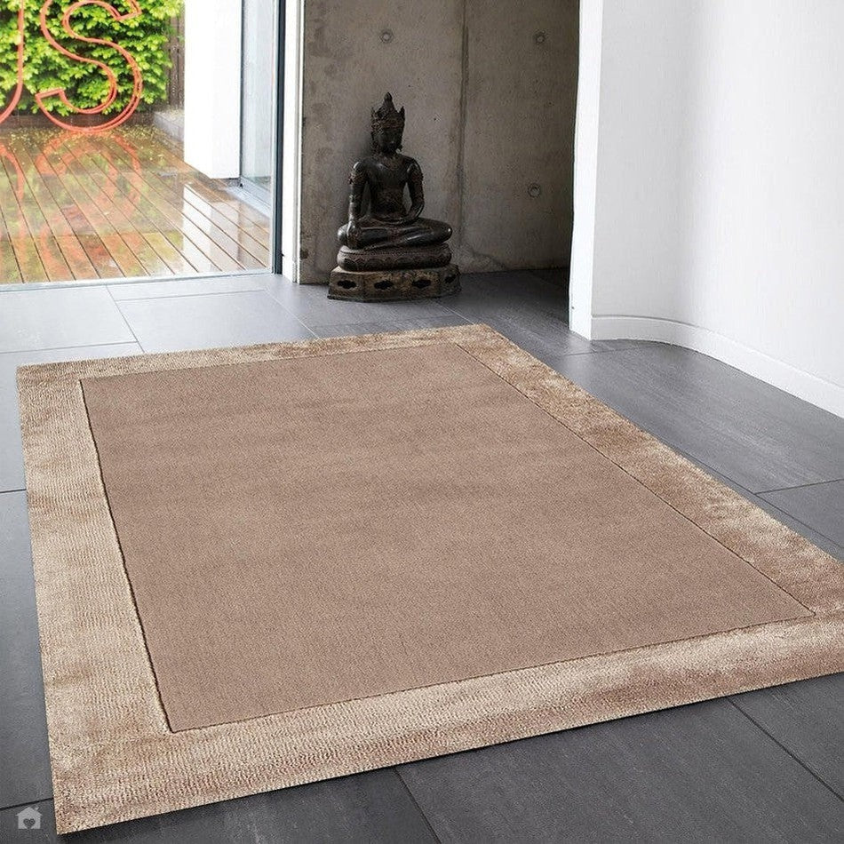 The Ascot Modern Plain Hand-Woven Wool Centred Loop Pile Metallic Shimmer Wide Viscose Border Warm Sand Beige/Golden Taupe Rug showcases a perfect balance of texture, tone, and craftsmanship. The Warm Sand Beige wool centre provides a serene and versatile base, while the Golden Taupe viscose border frames the rug with a soft sheen that changes beautifully under different lighting conditions.