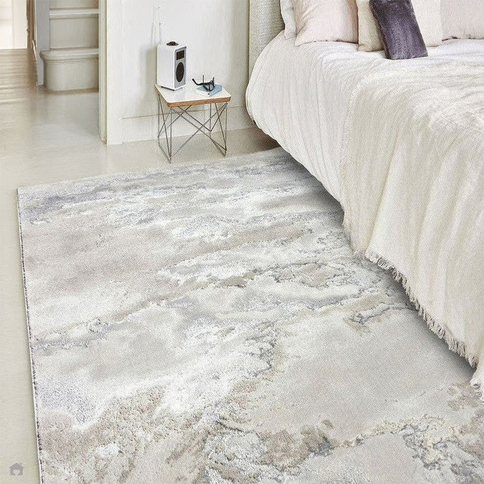 The Aurora AU02 Cloud Rug blends modern sophistication with timeless elegance, showcasing a distressed marbled abstract design elevated by a metallic shimmer finish. The tonal interplay of Grey, Beige, Silver, Cream, and White creates a soft, cloud-like aesthetic that shifts beautifully depending on light and viewing angle. Its smooth, low-profile cut pile delivers comfort underfoot while maintaining practicality, making it equally suited for living rooms, bedrooms, and dining spaces. With a refined balance of style, function, and subtle glamour, this rug enhances interiors with an atmosphere of calm luxury.