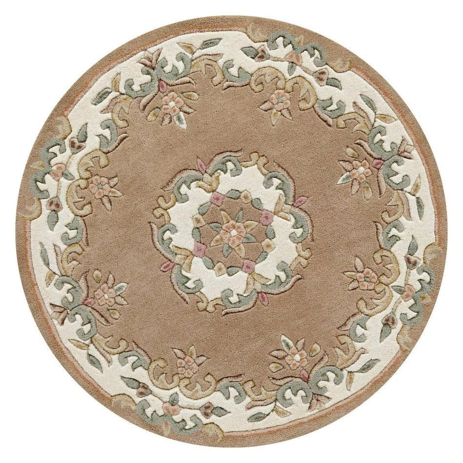 Royal Traditional Floral Aubusson Medallion Border Wool Round Rug in Beige. Bring a touch of classic sophistication to your home with the Royal Traditional Floral Aubusson Medallion Border Rug. Expertly hand-tufted from 100% pure wool in India, this rug combines traditional craftsmanship with timeless elegance, making it a perfect choice for vintage-inspired or classical décor. The design showcases a stunning central medallion, surrounded by a delicate floral border, and enhanced with a hand-carved hi-low texture for depth and dimension. Its soft pastel palette of beige, ivory, pinks, greens, and muted tones creates a sophisticated and serene foundation that elevates any room.