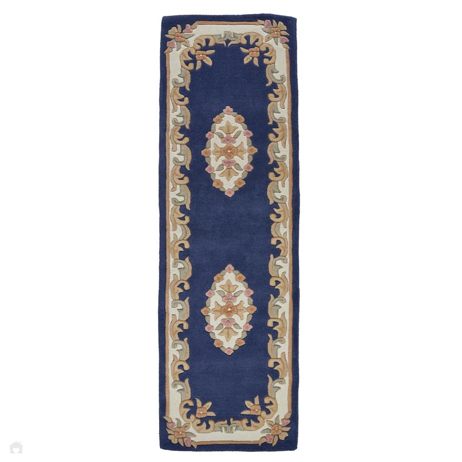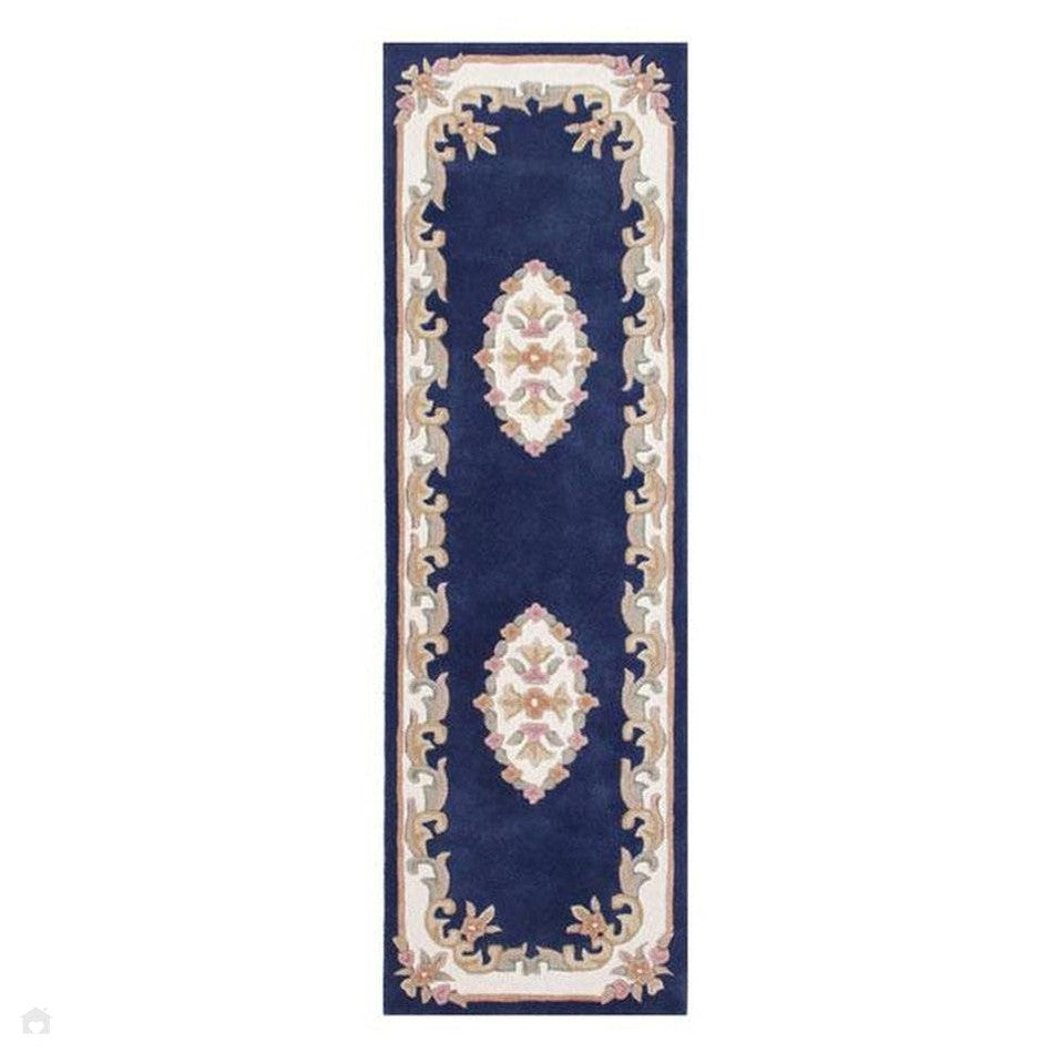 Royal Traditional Floral Aubusson Medallion Border Wool Runner in Blue. Transform your space into a refined sanctuary with the Royal Traditional Floral Aubusson Medallion Border Rug. Featuring a rich deep blue base, this exquisite rug brings a sense of luxury and sophistication to any interior. The design showcases a timeless central medallion, framed by a delicate floral border, with soft pastels of pink, cream, yellow, and green adding warmth and elegance. Expertly hand-tufted from 100% pure wool and hand-carved in India, this rug is crafted to provide both durability and a plush, soft texture underfoot.