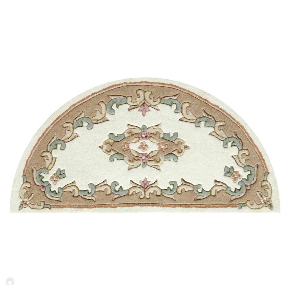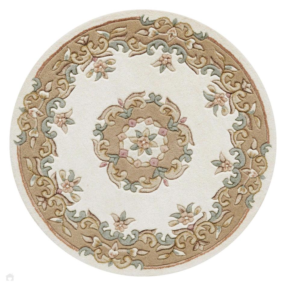 This rug is a traditional Aubusson-style masterpiece, combining soft neutral tones with delicate floral artistry. It features: