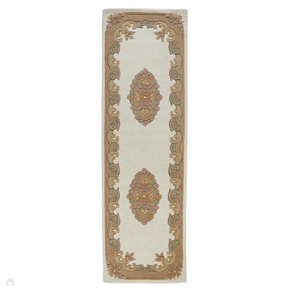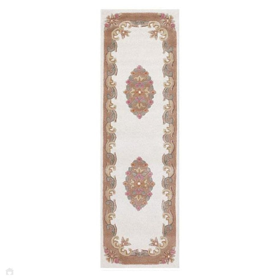 Royal Traditional Floral Aubusson Medallion Border Wool Runner in Cream & Beige. Introduce timeless elegance into your home with the Royal Traditional Floral Aubusson Medallion Border Rug in Cream & Beige. This refined piece pairs a soft cream and beige backdrop with intricate Aubusson-style floral detailing, making it a beautiful choice for both traditional and transitional interiors. The design features a central medallion motif, framed by a delicate floral border in muted pinks, greens, and taupe accents, creating a harmonious blend of warmth and sophistication. Hand-tufted from luxurious 100% wool and hand-carved for added depth, this rug is as durable as it is elegant, offering a plush feel underfoot.