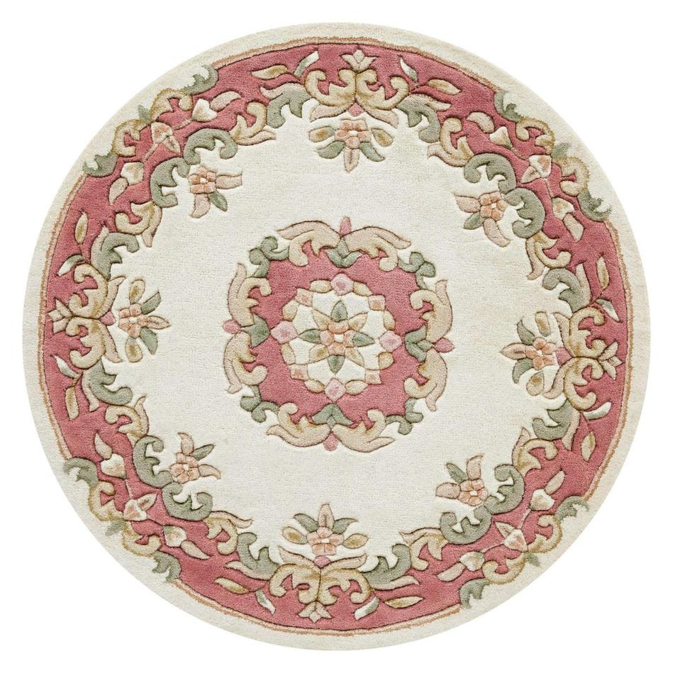 Royal Traditional Floral Aubusson Medallion Border Wool Round Rug in Cream & Pink. Introduce a touch of timeless beauty to your home with the Royal Traditional Floral Aubusson Medallion Border Rug in Cream & Pink. This luxurious piece combines a classic Aubusson-inspired design with soft floral accents, creating an inviting and romantic atmosphere for any room. The elegant cream background serves as a serene foundation, while the dusky rose pink border adds a gentle pop of colour that warms and brightens your space. The intricate floral patterns, highlighted in soft pink, muted green, and antique gold, surround a beautifully detailed medallion centre, offering a traditional yet fresh aesthetic that works beautifully in both classic and transitional interiors.