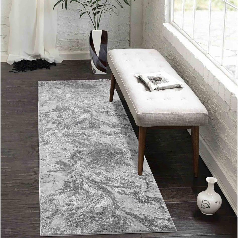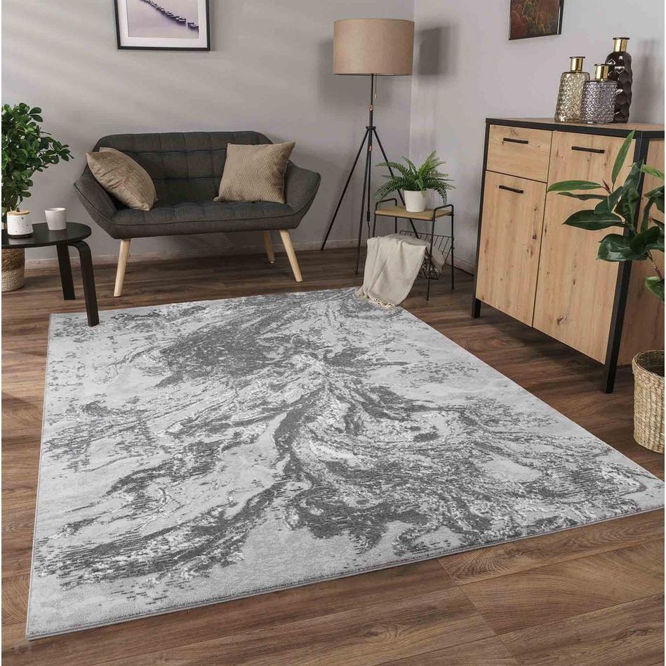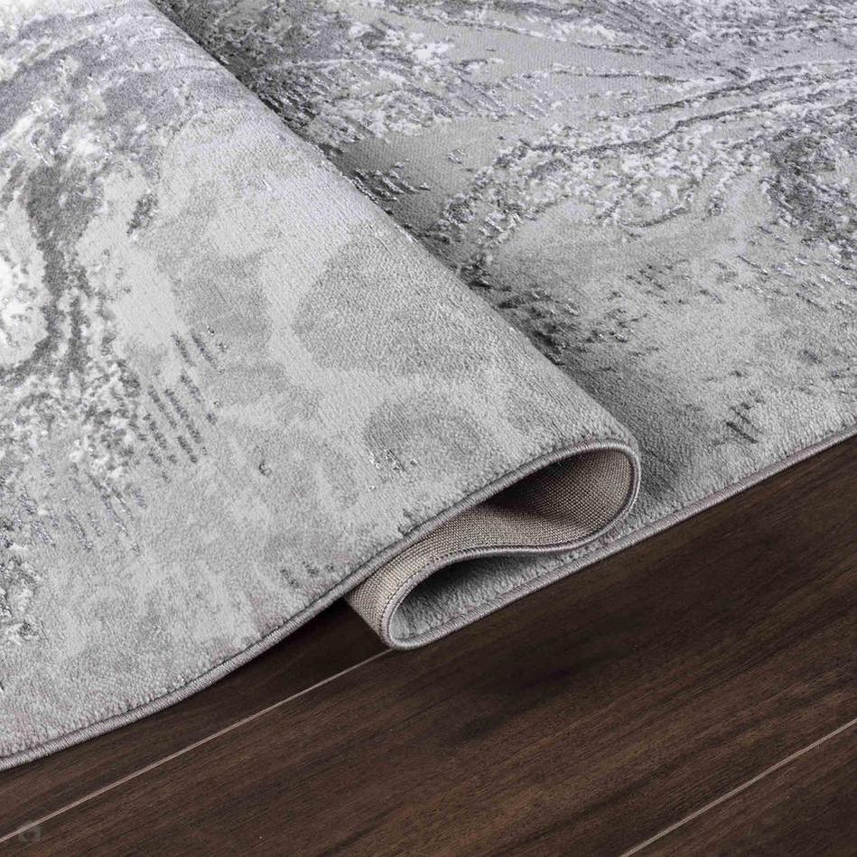 The Serenity 268 SRN68 Grey Rug is a sophisticated statement piece featuring a flowing abstract marbled pattern in Cool Grey, Charcoal Grey, Silver, Pale Grey, and hints of Frosted Blue-Grey. This design offers a versatile and refined aesthetic that suits both light and dark interiors. Crafted in Turkey from a durable polypropylene and polyester blend, it boasts a 12mm soft cut pile with a textured shimmer finish that changes appearance depending on the direction of the pile and the angle of the light—making it look lighter or darker from different sides. Its machine-woven construction ensures it is durable, non-shedding, and perfect for living rooms, bedrooms, dining spaces, and open-plan interiors seeking a modern yet timeless rug. The pile’s direction subtly shifts under light, making the rug appear lighter or darker depending on the viewing angle – a feature that adds dimension and visual intrigue.