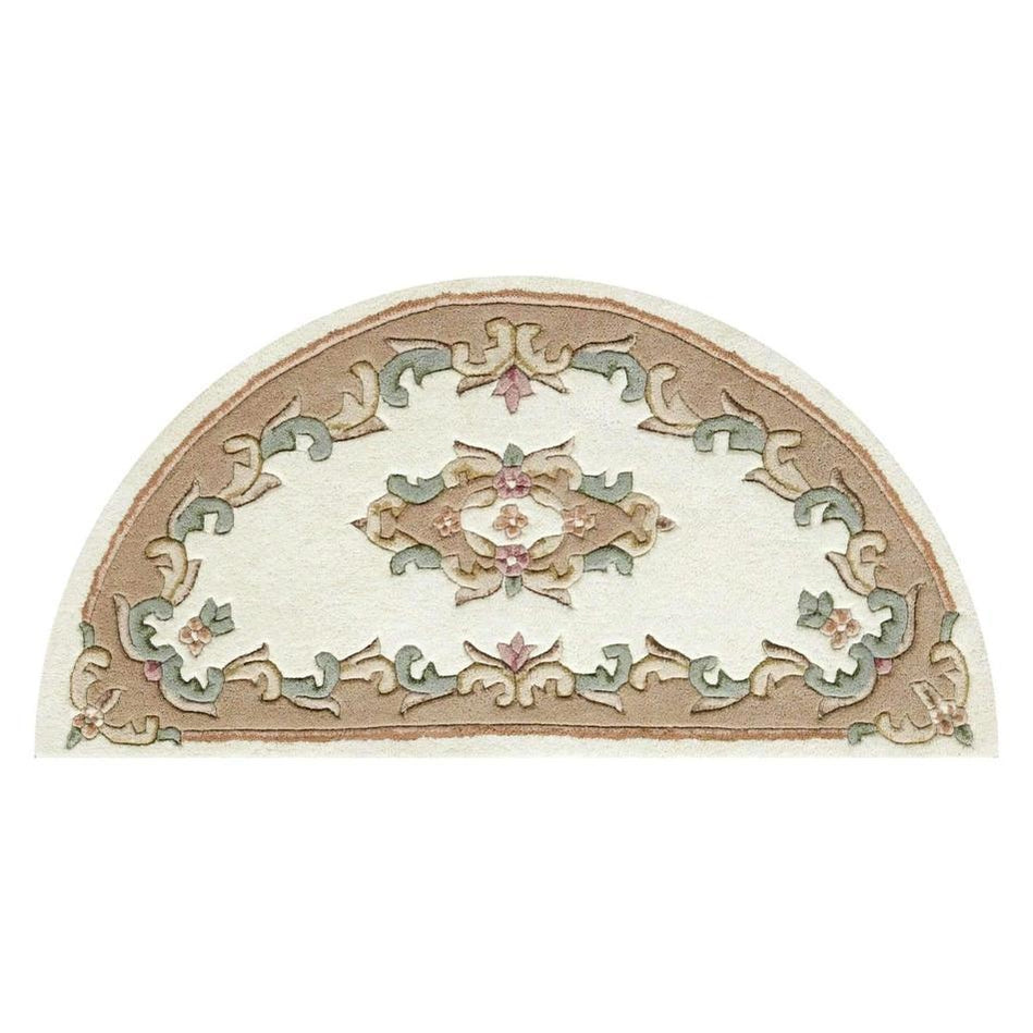 Royal Traditional Floral Aubusson Medallion Border Wool Half Moon Rug in Cream & Beige. Introduce timeless elegance into your home with the Royal Traditional Floral Aubusson Medallion Border Rug in Cream & Beige. This refined piece pairs a soft cream and beige backdrop with intricate Aubusson-style floral detailing, making it a beautiful choice for both traditional and transitional interiors.