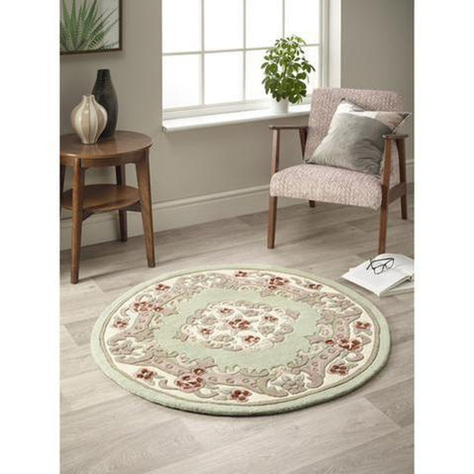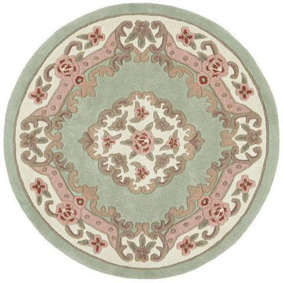Shensi Traditional Floral Aubusson Green Round Rug. The Shensi range of traditional rugs offers timeless appeal, with its classic Aubusson-inspired floral medallion and ornate border detailing. Hand-tufted by expert rug makers from the finest 100% pure wool, this rug features a carved hi-low pile that enhances its textured design and adds depth. With its durable construction and elegant finish, it is a versatile choice that brings warmth and character to any room in the home.