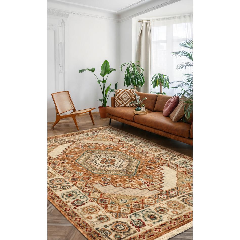 The New Nomad Traditional Terracotta Rug features a striking geometric medallion design inspired by classic Persian and Middle Eastern rug artistry. The harmonious interplay of Terracotta, Ivory, Soft Beige, Rust Red, Sage Green, Olive Green, Teal Blue, and Charcoal Grey creates a warm and inviting palette perfect for adding depth and character to a room. Machine-woven in Egypt from a premium 80% wool, 20% nylon blend, this rug boasts a Low Profile 6mm textured loop pile with a jute backing, offering durability, resilience, and a comfortably tactile finish underfoot. Ideal for living rooms, dining rooms, and cosy snug areas, this rug pairs beautifully with neutral décor or warm wood tones, making it a versatile choice for traditional and modern interiors alike. A rug grip is recommended to prevent slipping and keep the rug securely in place.