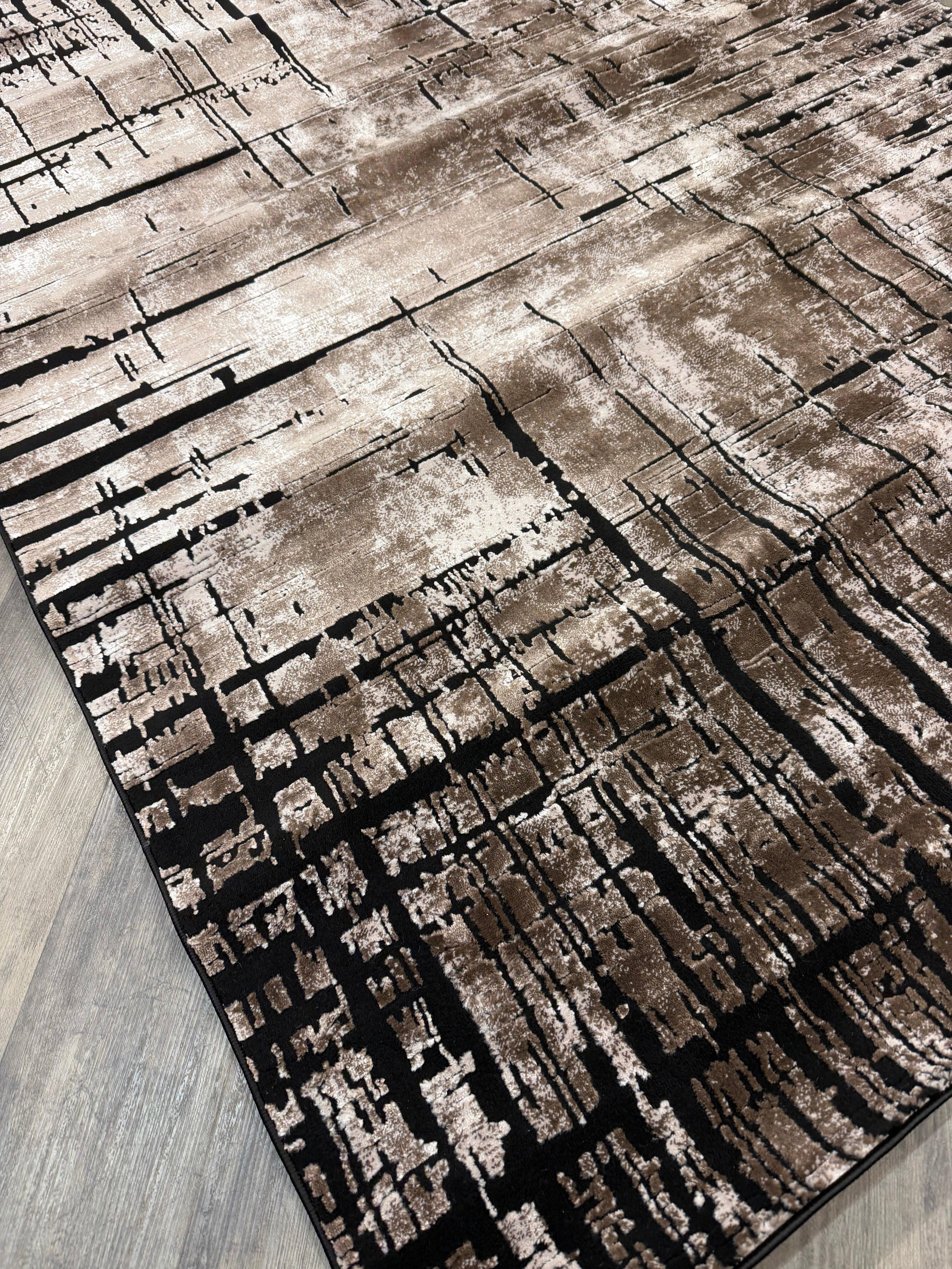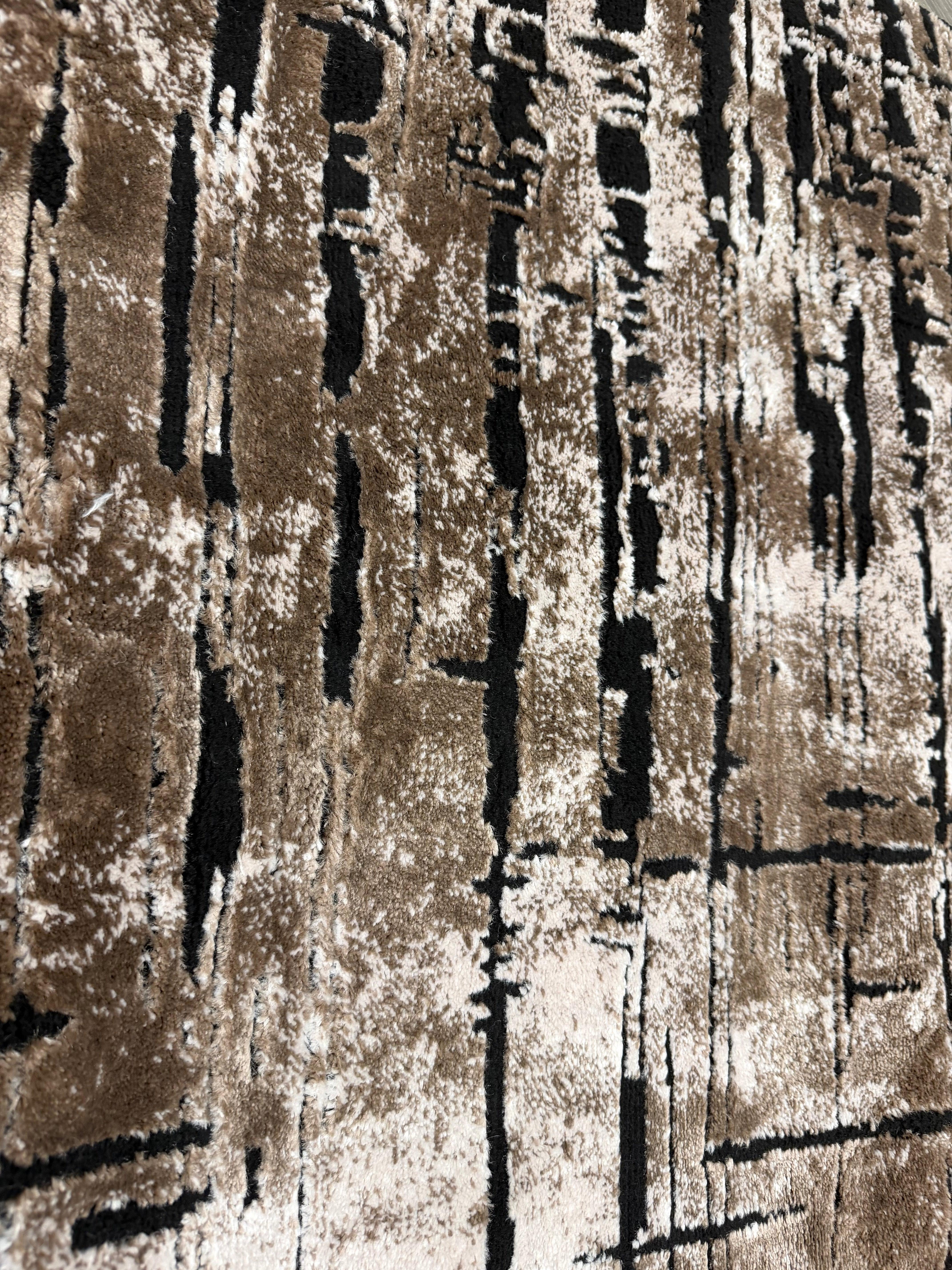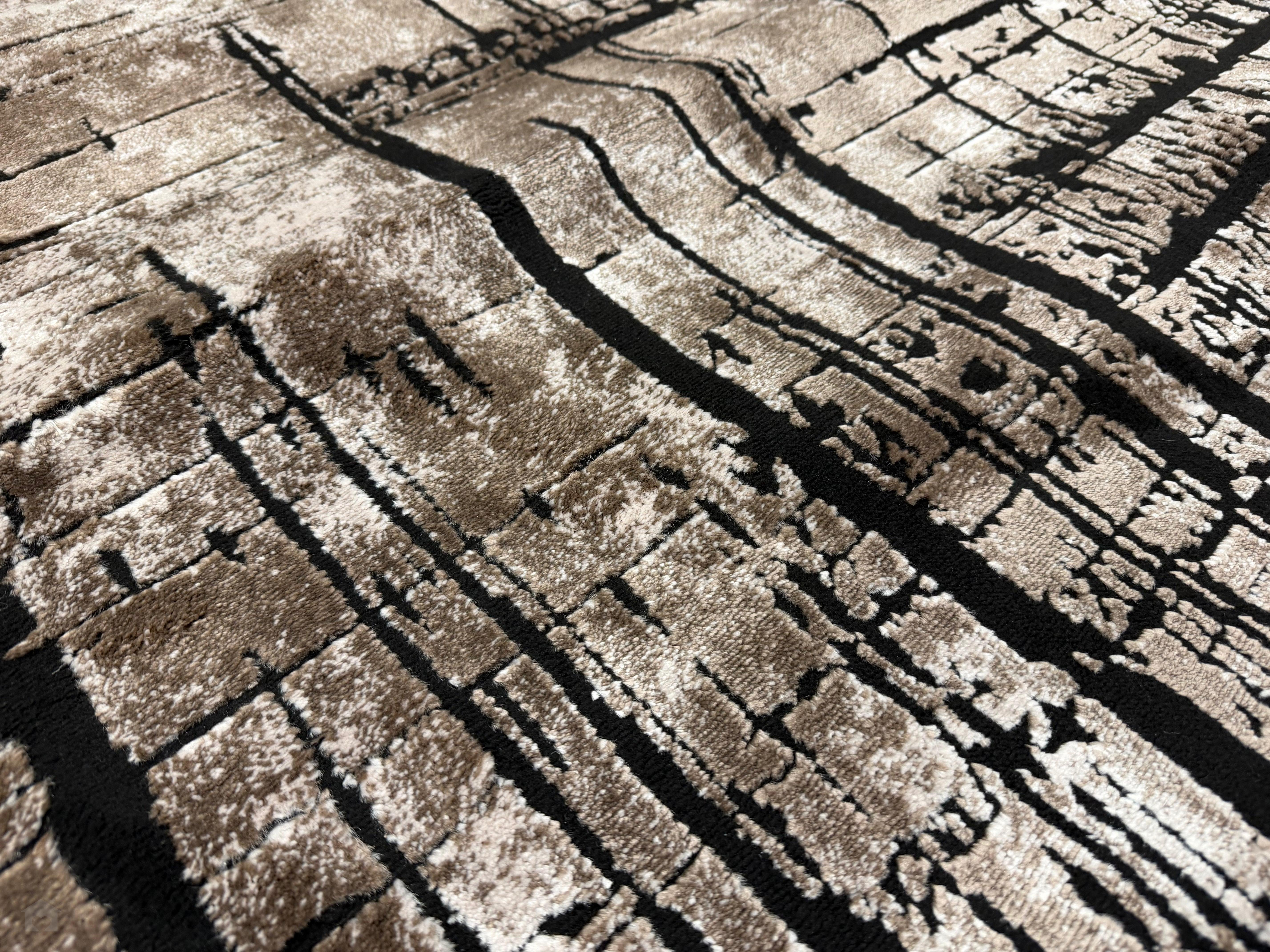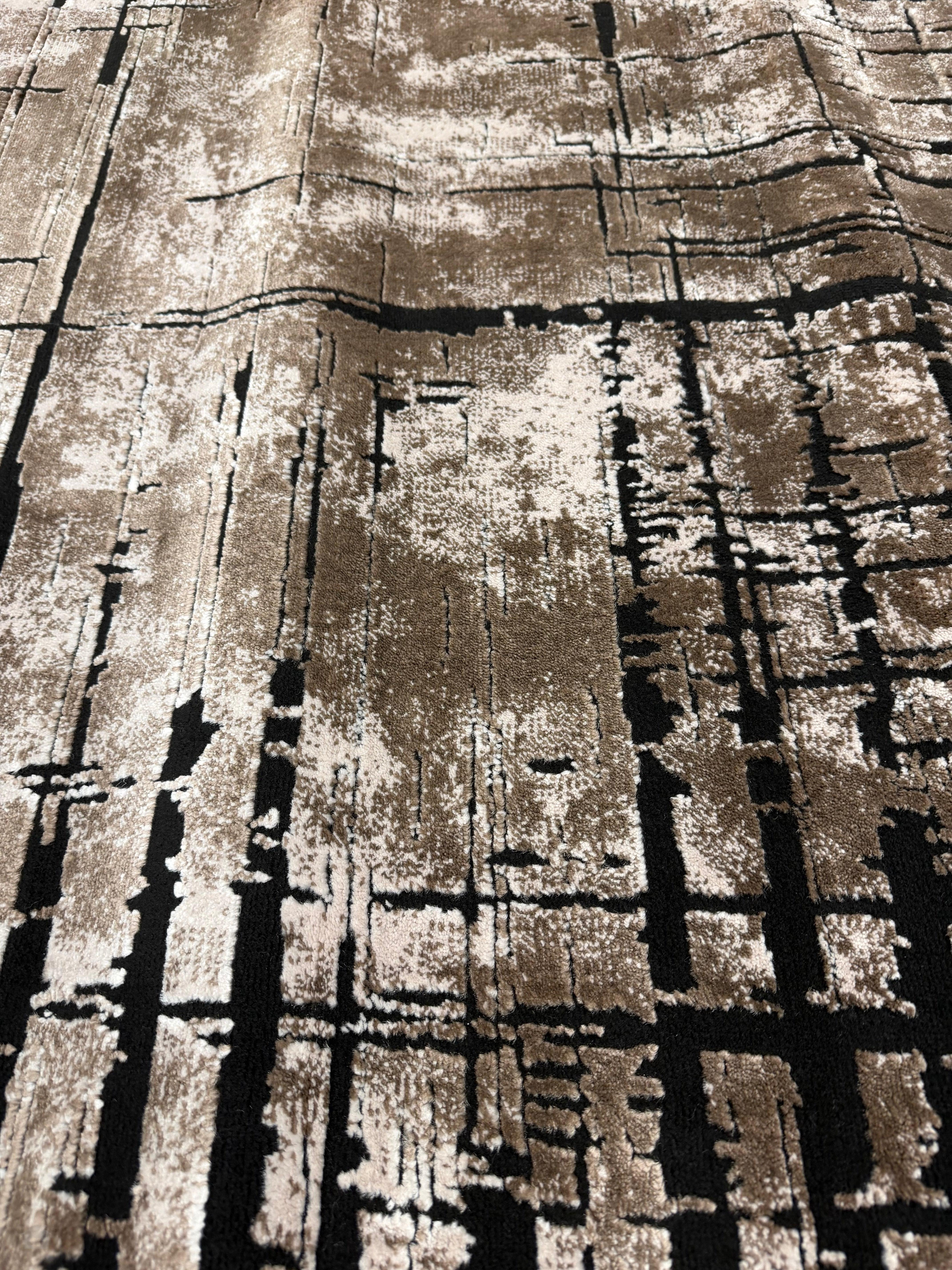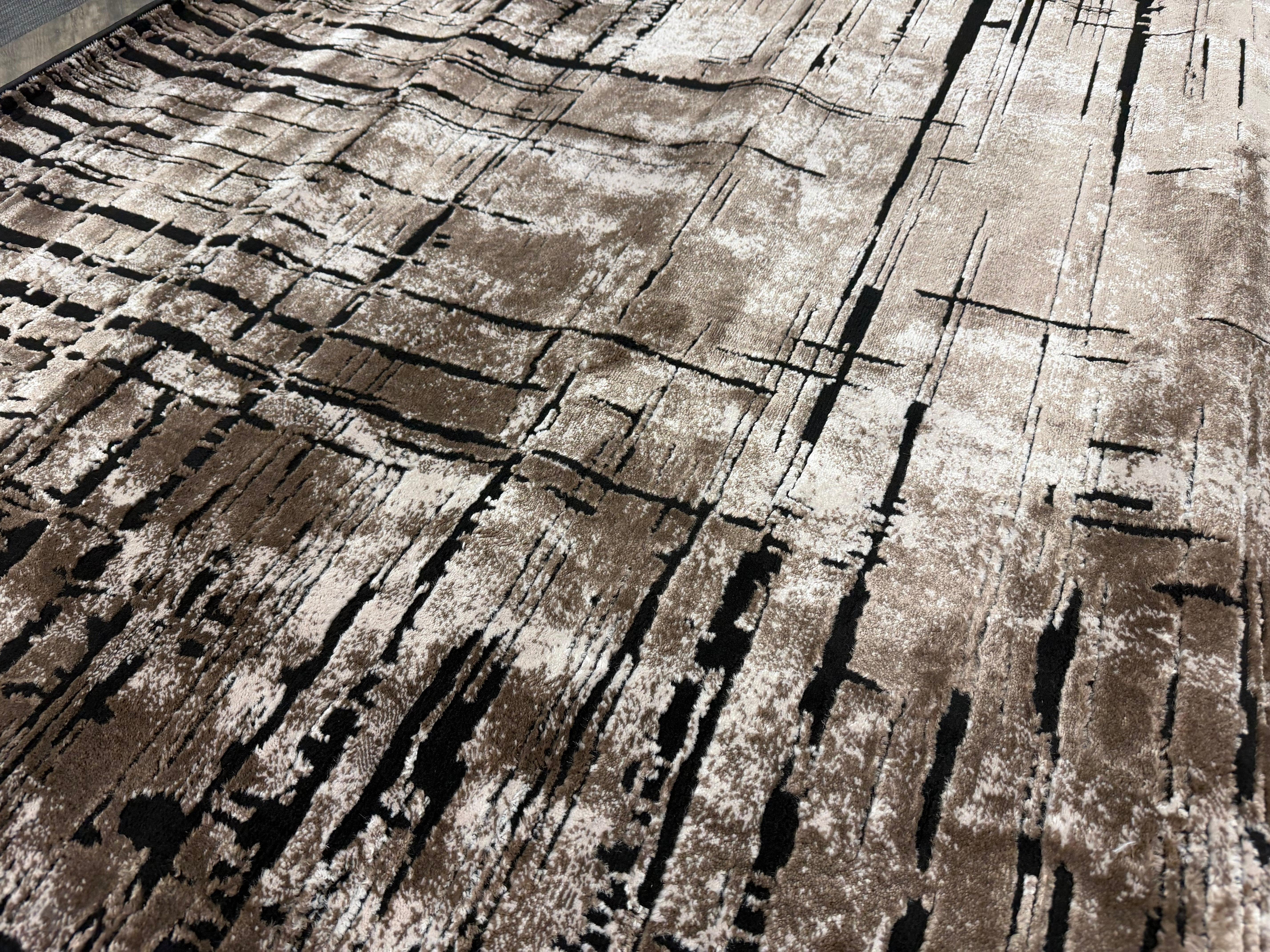 The Belgravia Nexus Mocha Rug features a modern abstract design with a bold linear pattern layered over a distressed, textured base. Its palette of Mocha Brown, Taupe, Ivory, and Charcoal creates a warm yet contemporary aesthetic, making it versatile for both neutral and statement interiors. The velvet-like cut pile offers a metallic sheen that changes with the light, giving this rug a luxurious, designer finish. Crafted in Turkey from a durable blend of polypropylene and polyester with a cotton backing, and with a 12 mm pile height, this rug combines resilience with comfort, making it ideal for modern living spaces, lounges, and bedrooms seeking both style and practicality. The pile’s direction subtly shifts under light, making the rug appear lighter or darker depending on the viewing angle – a feature that adds dimension and visual intrigue.