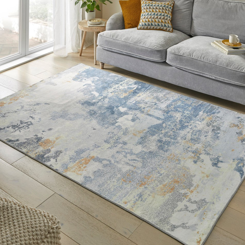 The Lux Washable LUX10 Rug presents a beautifully balanced abstract distressed pattern in a palette of Ivory, Soft Grey, Sky Blue, Steel Blue, and Golden Ochre. Crafted from 100% polyester faux rabbit fur with a silky-smooth 9mm low-profile pile, this rug offers a luxuriously soft touch while remaining fully washable and stain-guard protected for everyday practicality. Its machine-woven, no-shedding construction ensures durability and easy care, making it perfect for living rooms, bedrooms, and open-plan interiors. The subtle interplay of cool and warm tones gives this rug a sophisticated yet inviting aesthetic, ideal for brightening up modern spaces.