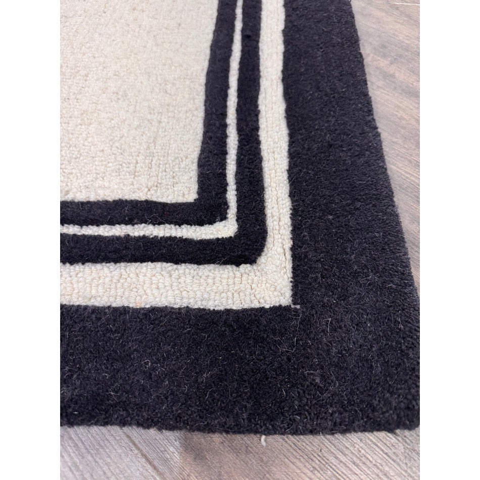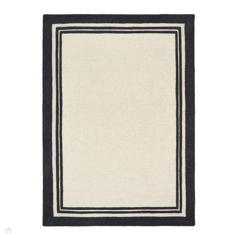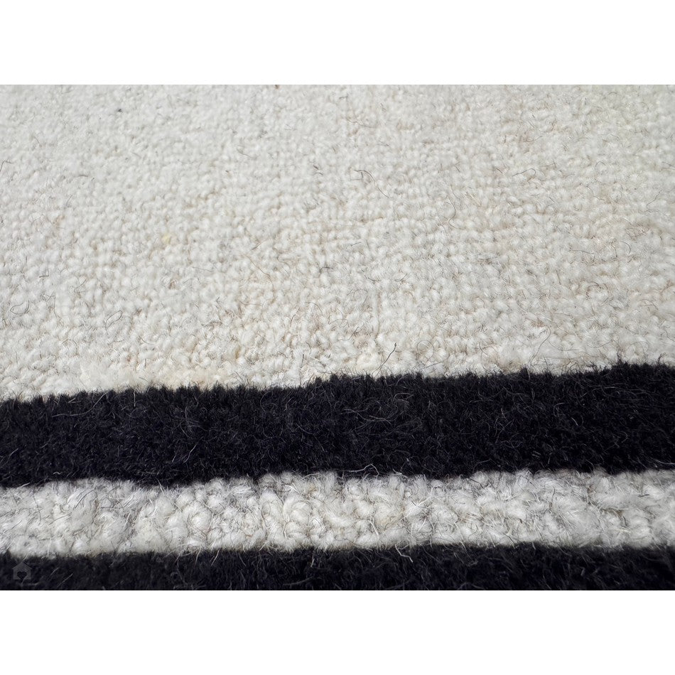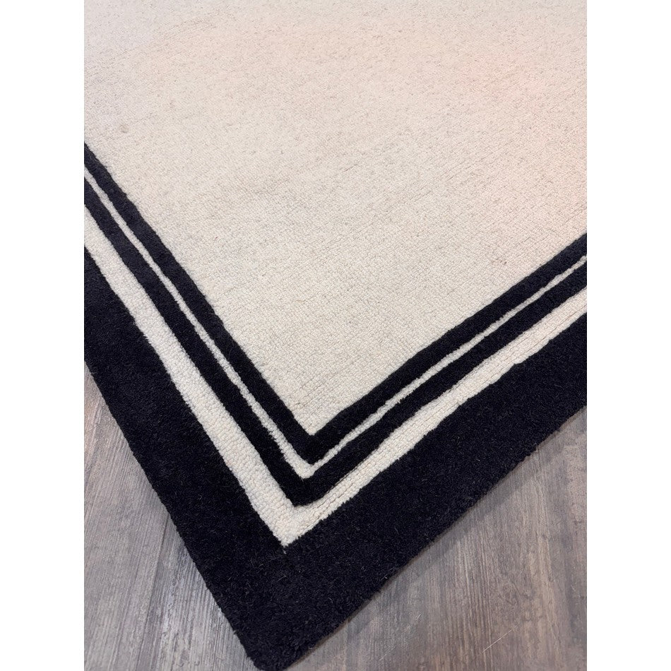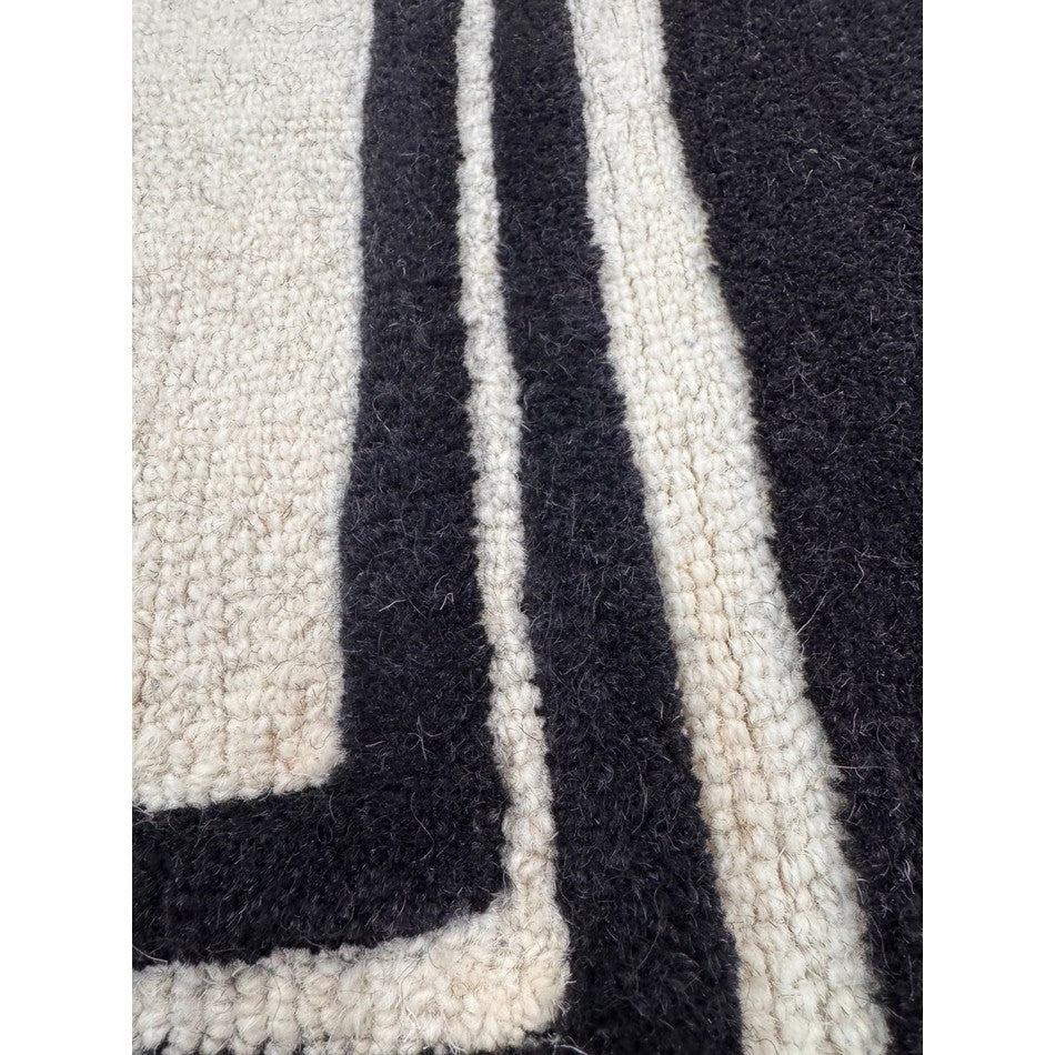Hand-woven in India from 100% pure wool, this rug features a 2cm pile height and an impressive 2000g/m² pile weight, ensuring both durability and comfort. The loop pile central section provides texture and resilience, while the smooth cut pile borders add definition and structure. The bold outer black edge, complemented by two finer inner borders, frames the cream centre in a design inspired by luxury hotel interiors, creating a clean and polished finish that enhances any room.