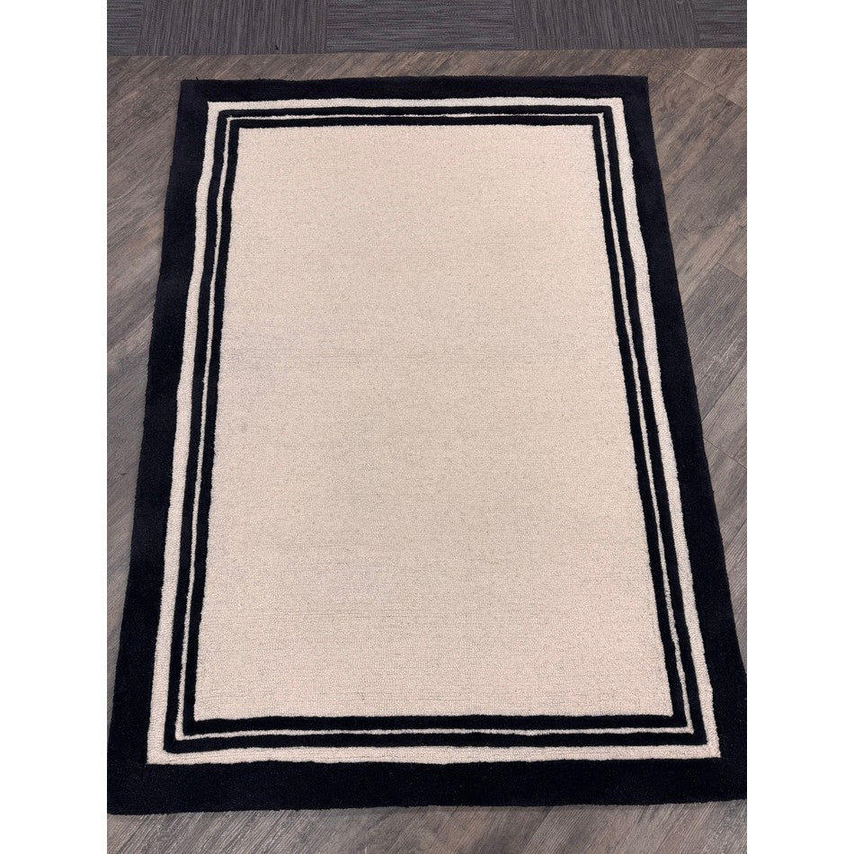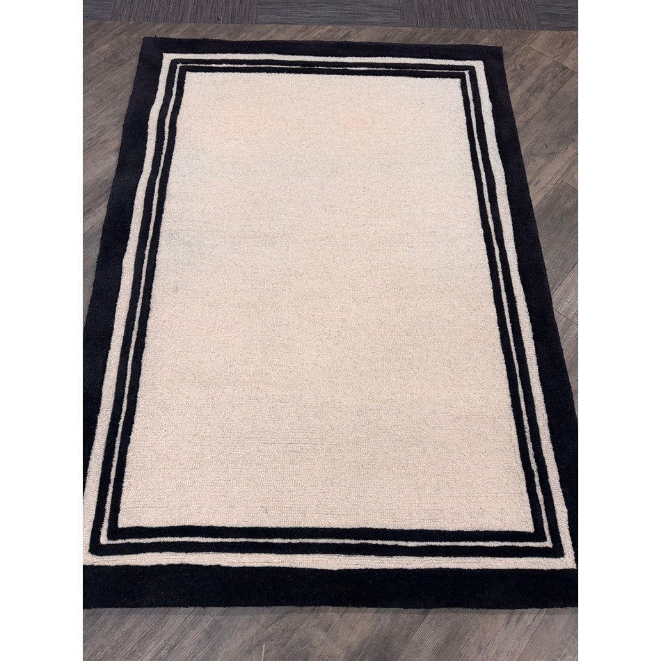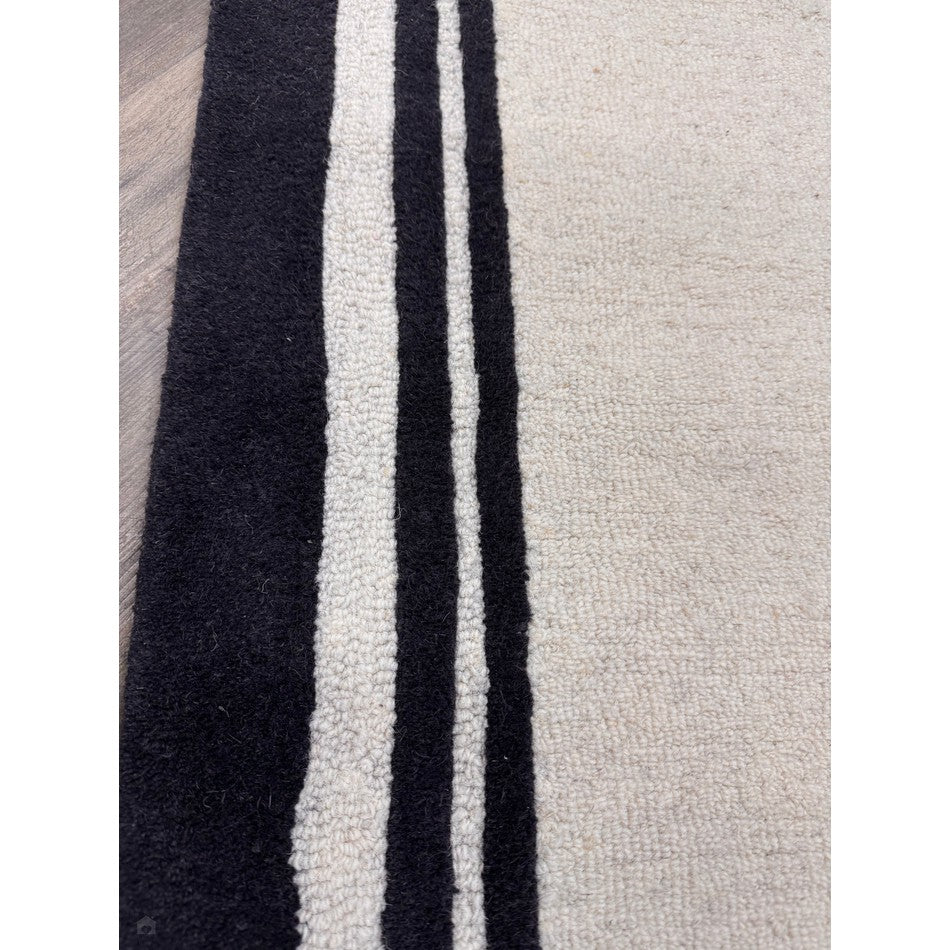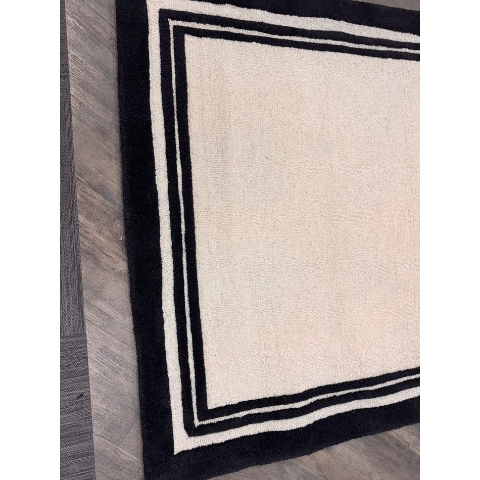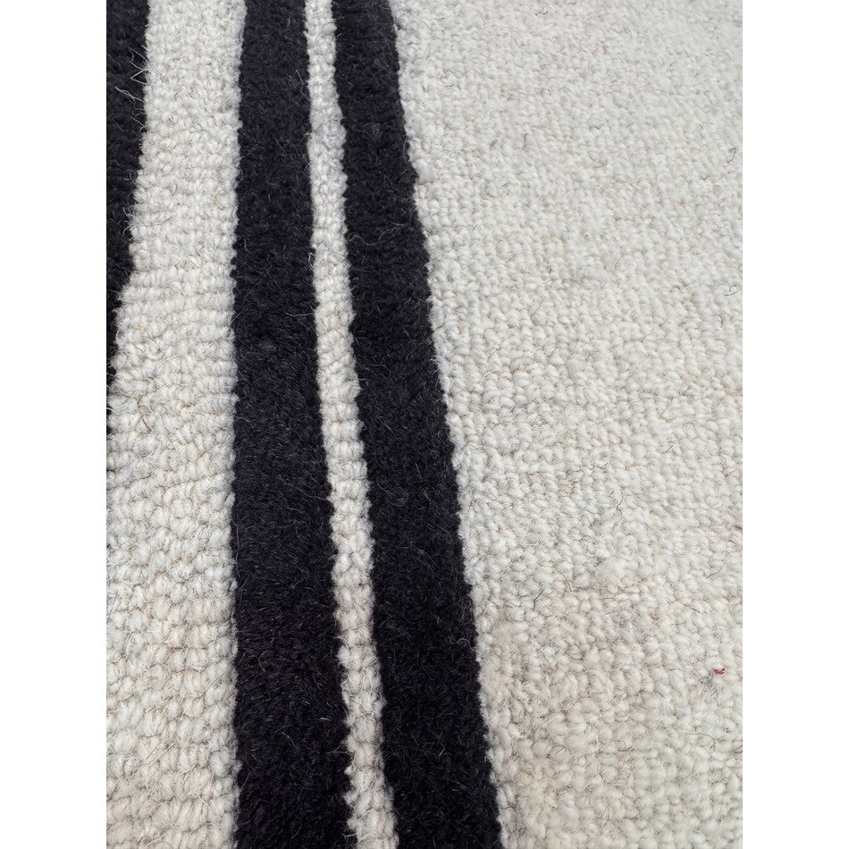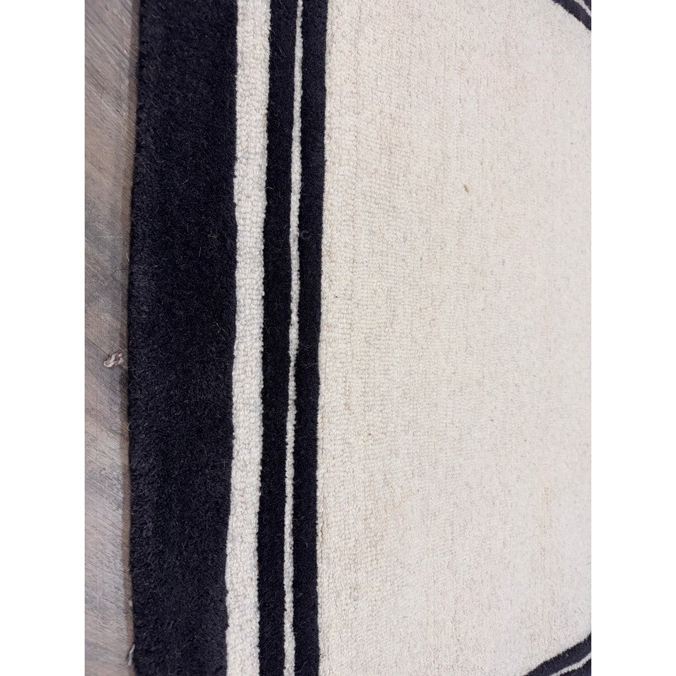 Hand-woven in India from 100% pure wool, this rug features a 2cm pile height and an impressive 2000g/m² pile weight, ensuring both durability and comfort. The loop pile central section provides texture and resilience, while the smooth cut pile borders add definition and structure. The bold outer black edge, complemented by two finer inner borders, frames the cream centre in a design inspired by luxury hotel interiors, creating a clean and polished finish that enhances any room.