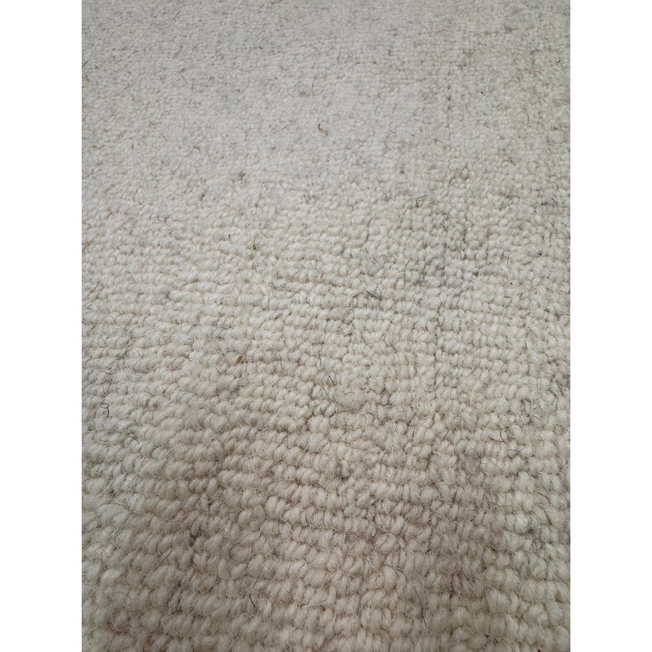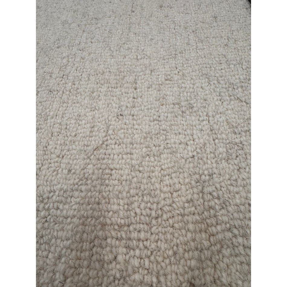 The central loop pile will feature irregularities, such as uneven loops or stray fibres, which are natural characteristics of handcrafted wool rugs.