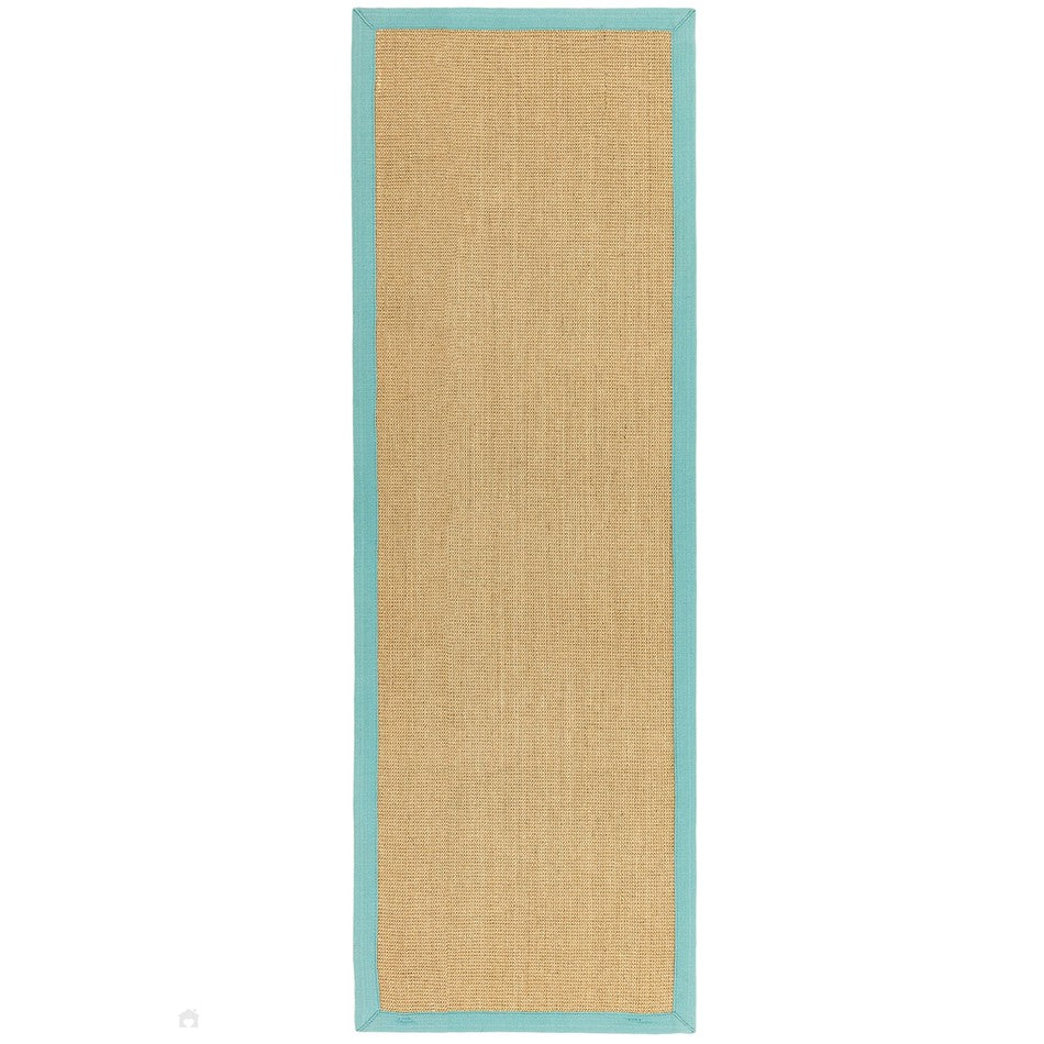 The Sisal Plain Border Natural/Aqua Blue Rug from the Sisal collection combines earthy natural texture with a refined contemporary edge. Expertly crafted from 100% natural sisal fibres, it features a ribbed flatweave design with a distinctive handwoven look and tactile texture that highlights the beauty of raw plant fibres. The surface has a firm, slightly coarse feel typical of sisal, making it durable, resilient, and ideal for high-traffic areas. Finished with a cotton border for definition and an anti-slip backing for added stability, this rug is both practical and stylish—perfect for hallways, kitchens, and modern living spaces.