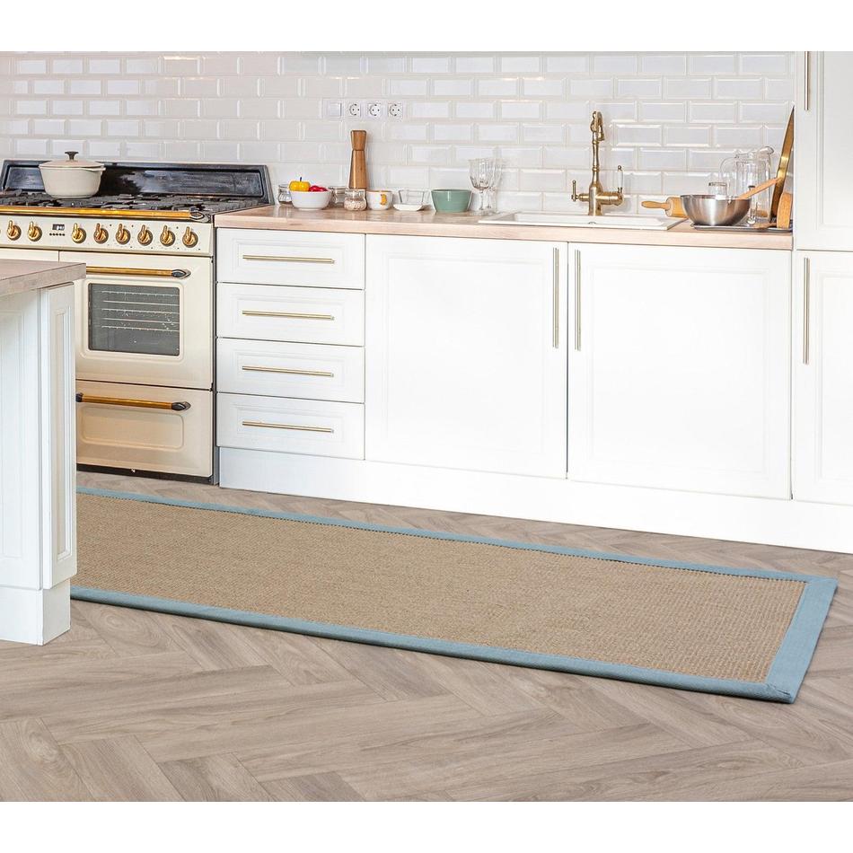 The Sisal Plain Border Natural/Aqua Blue Rug is a beautifully practical natural fibre flatweave, made from 100% sisal with a cotton border and anti-slip backing for secure placement. The interplay of Natural Wheat and Sage Green tones delivers a grounded, organic look that’s equally at home in contemporary kitchens, country-style dining areas, or neutral living spaces. With its textured ribbed surface, durable construction, and timeless appeal, this rug brings warmth, structure, and natural elegance to everyday interiors.