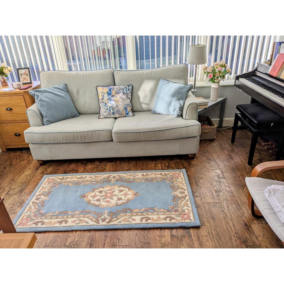 The Shensi Traditional Floral Aubusson Blue Rug blends Powder Blue, Ivory, Dusty Rose, Moss Green, Warm Taupe, and Charcoal Brown into a beautifully balanced palette. With its hand-carved hi-low wool pile, 2.5cm thickness, and expert hand-tufted finish, this rug combines traditional elegance with durability. Perfect for adding character and timeless style to living rooms, bedrooms, and dining spaces, it offers both comfort and sophistication for classic and transitional interiors.