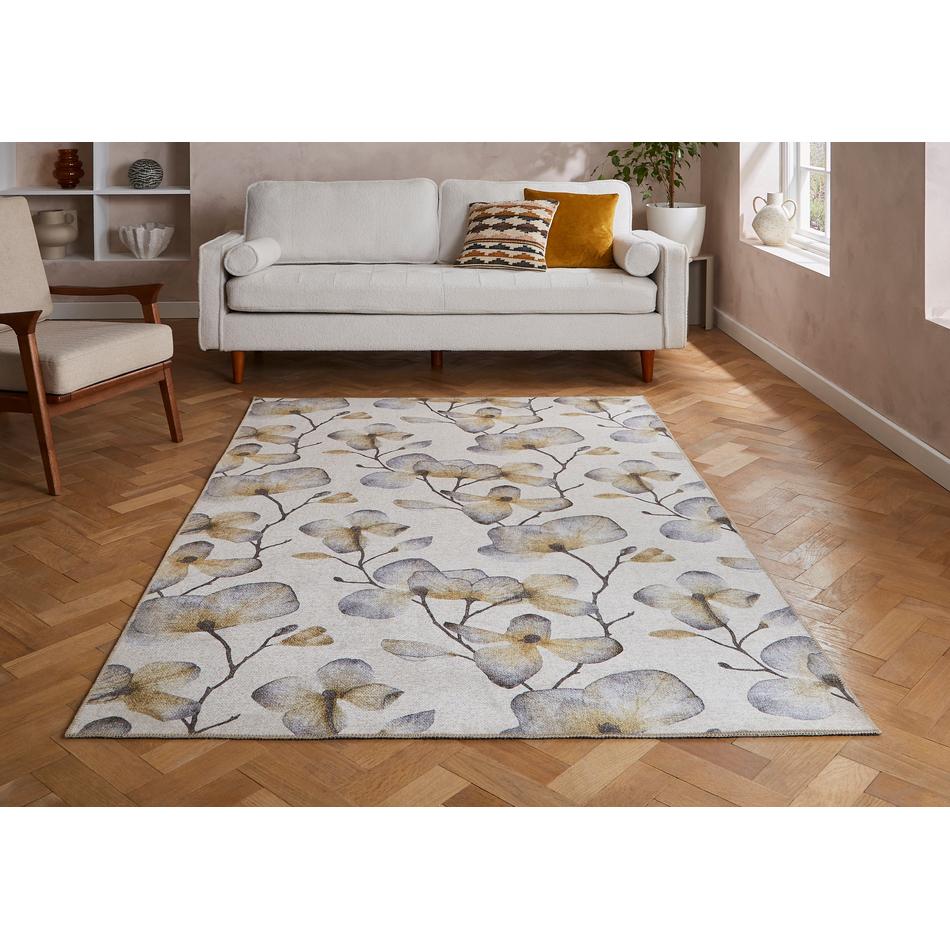 Washable Harlequin Kienze Ochre Modern Floral Botanical Textured Lightweight Printed Recycled Polyester Flatweave Soft Ivory/Ochre/Slate/Charcoal Brown/Antique Gold Runner