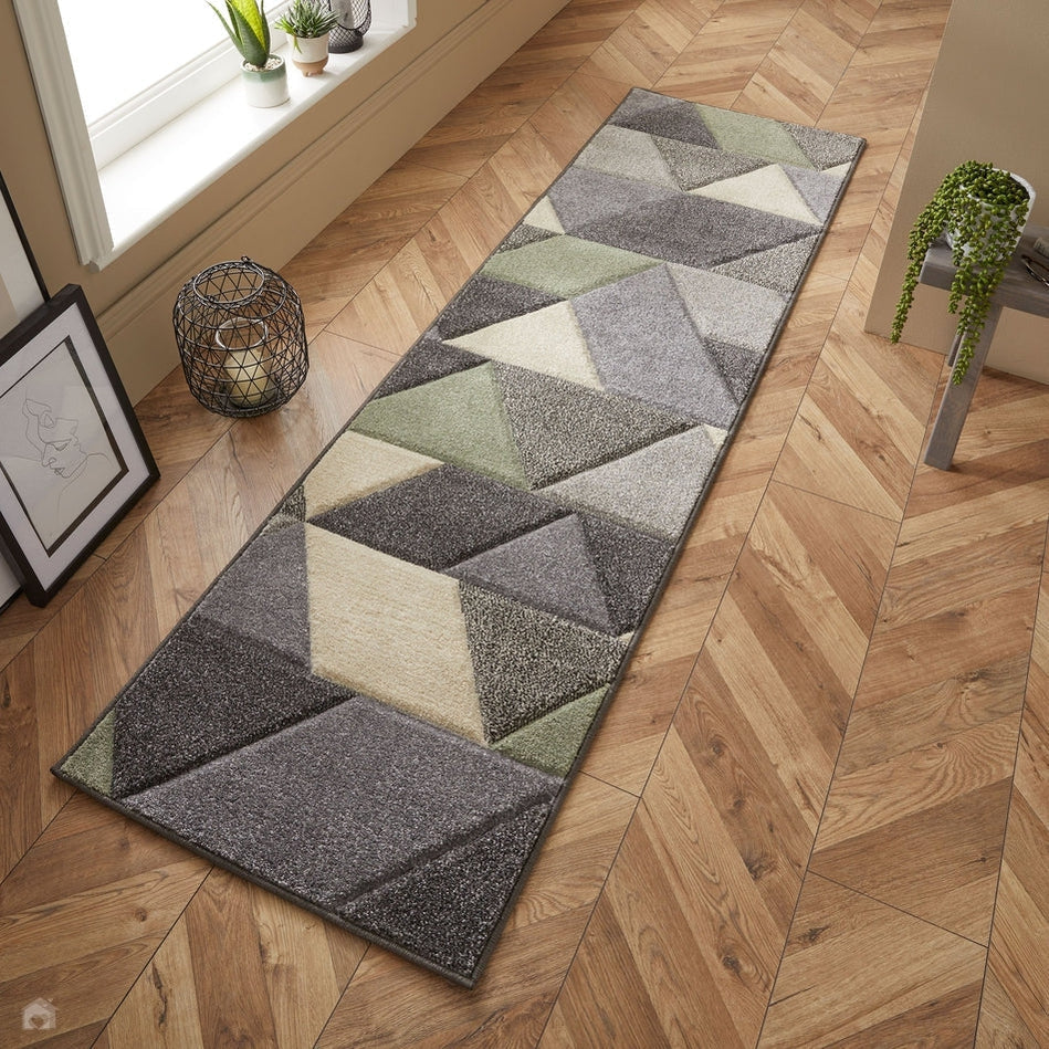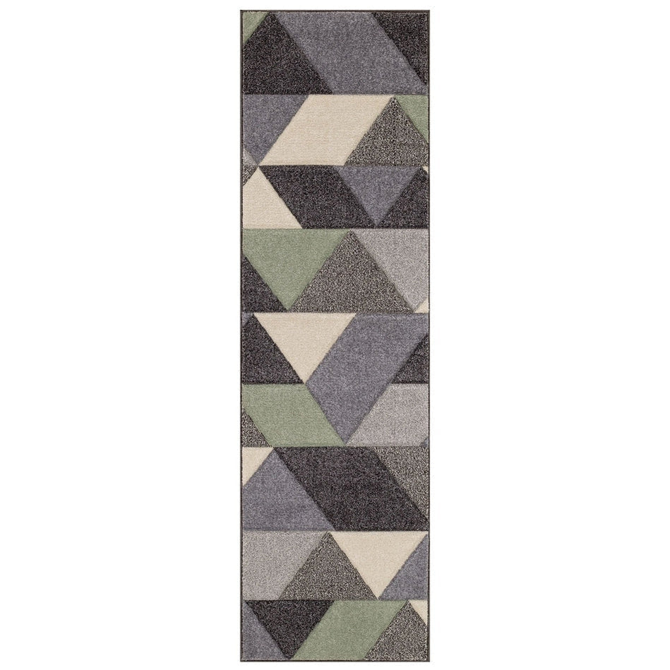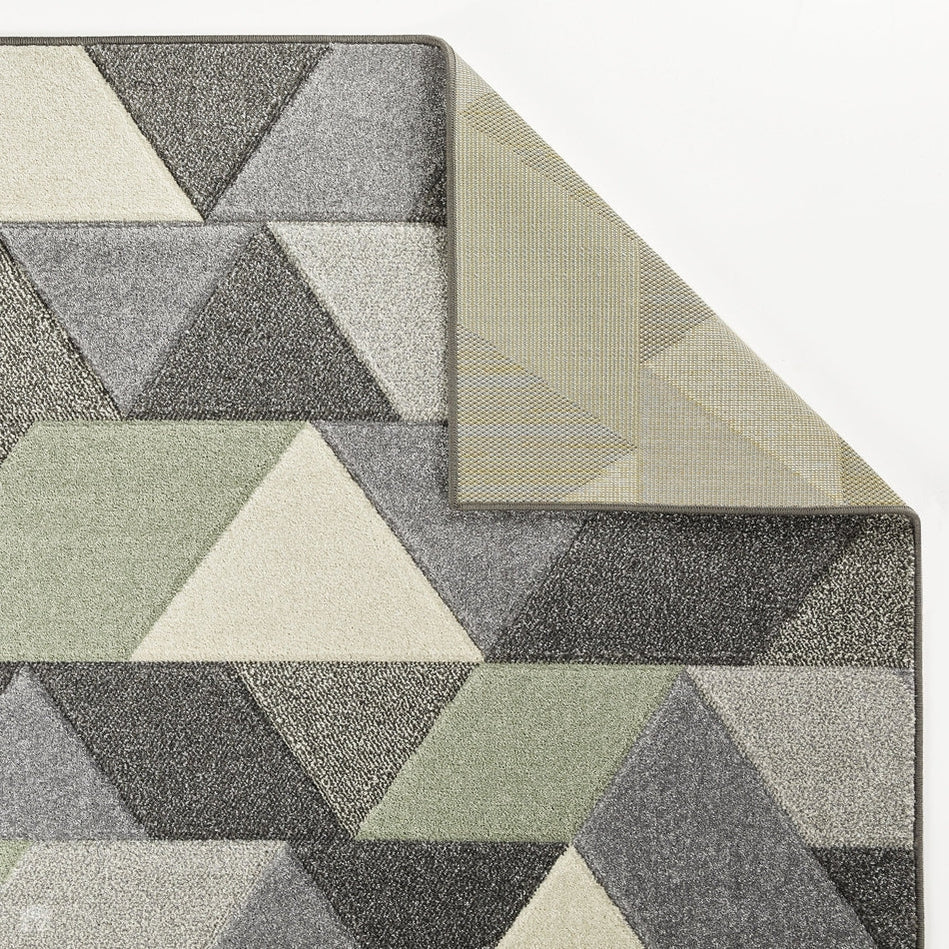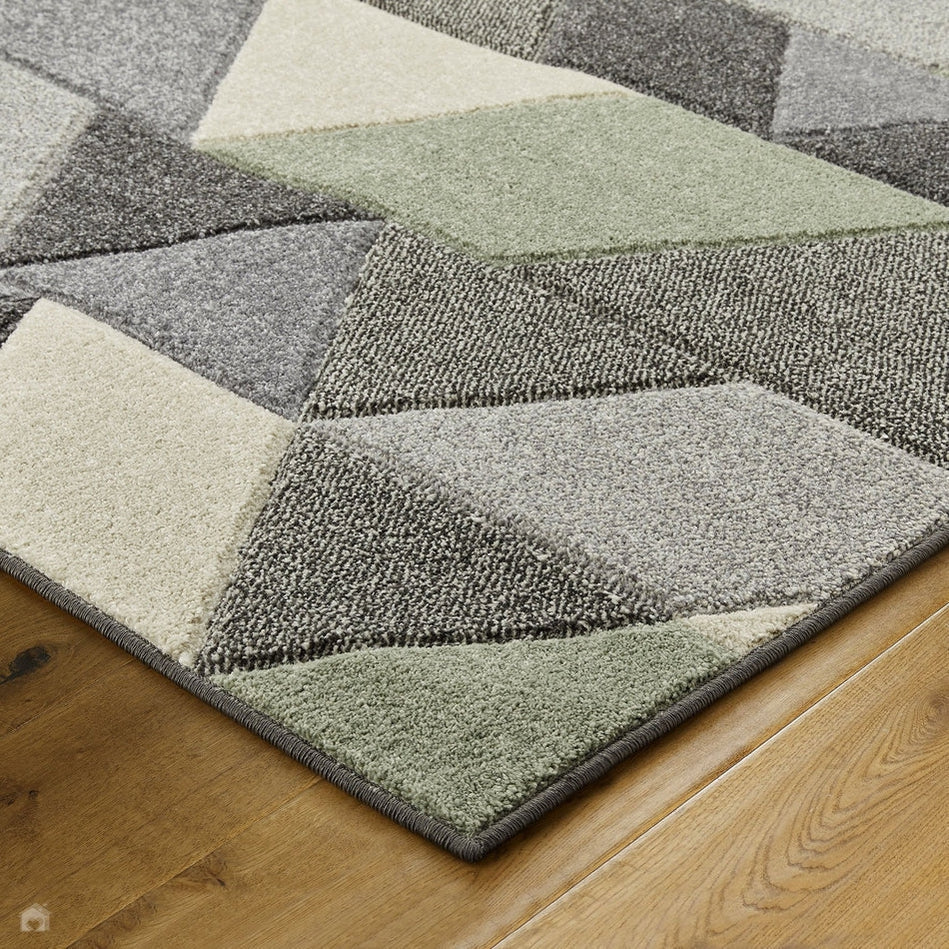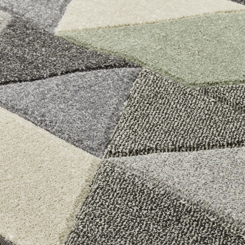This rug features a dynamic geometric pattern in a sophisticated mix of soft sage and muted olive greens, blended with neutral greys, beige, and off-white. The interplay of light and dark tones enhances the depth and texture, making it a stylish yet versatile choice for both modern and classic interiors.