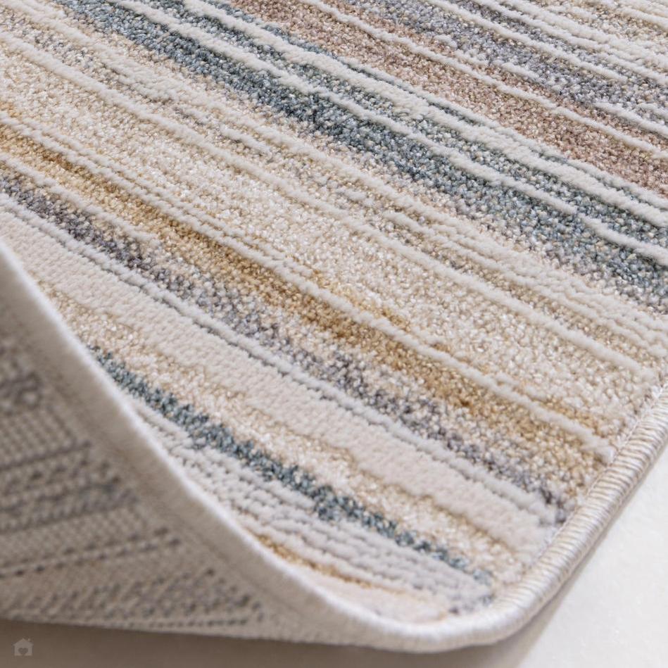 This rug combines a structured linear design with a beautifully layered colour palette of ivory, taupe, grey, slate blue, and golden beige. The result is a contemporary yet versatile piece with a soft shimmer and low-profile texture. Its subtly distressed look adds movement and interest without overpowering a room, making it a refined choice for neutral interiors with a modern edge or tonal spaces needing just a hint of contrast.