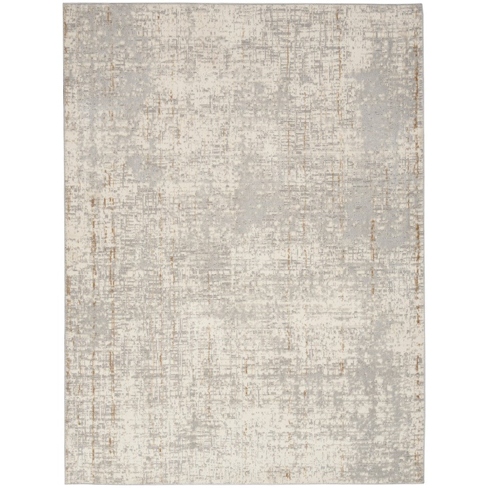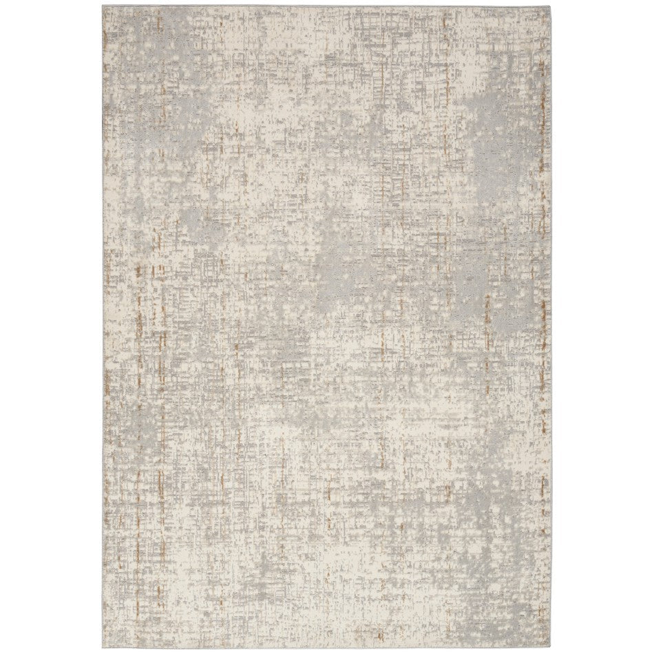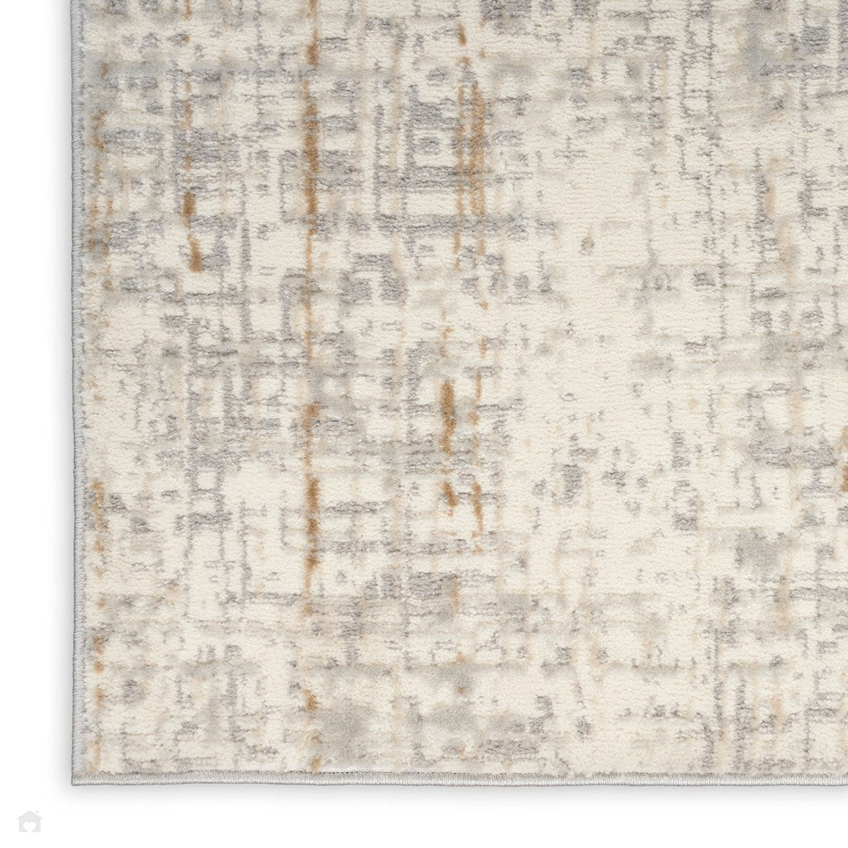 Its textured hi-low short pile brings depth and tactile dimension to the abstract composition, while the 8 mm low-profile height ensures easy placement beneath furniture. The smooth cut pile surface interacts subtly with light, enhancing the layered tones of ivory, grey, and beige for a soft, contemporary finish.