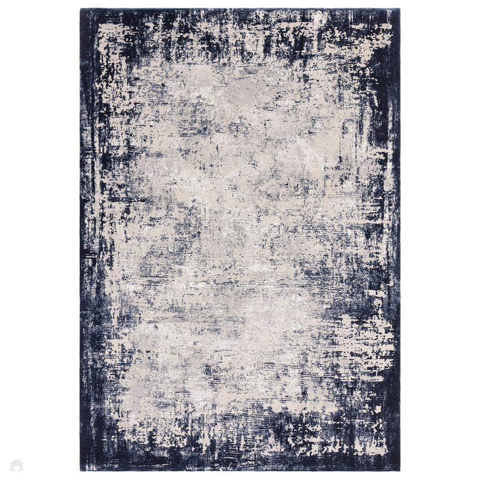 Its abstract distressed pattern is elegantly framed by a deep navy border, creating bold contrast and visual definition. The combination of navy, light grey, and cream gives the rug a striking yet balanced aesthetic, ideal for grounding contemporary interiors with depth and character.