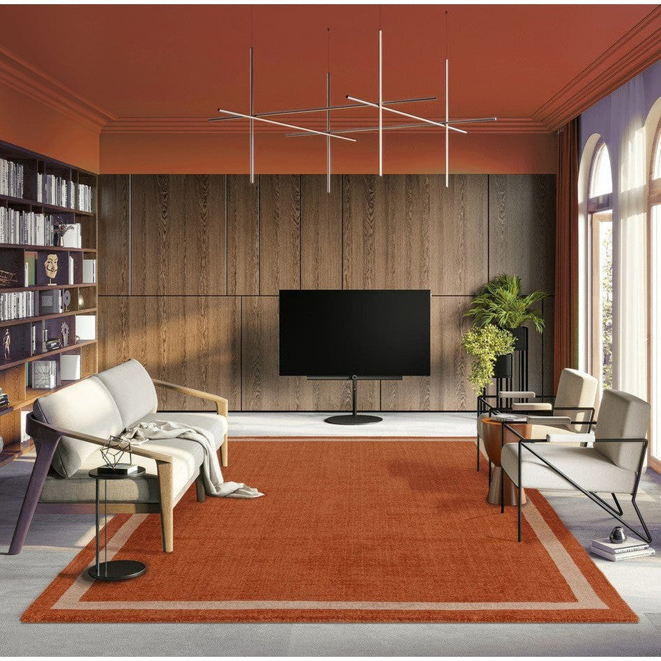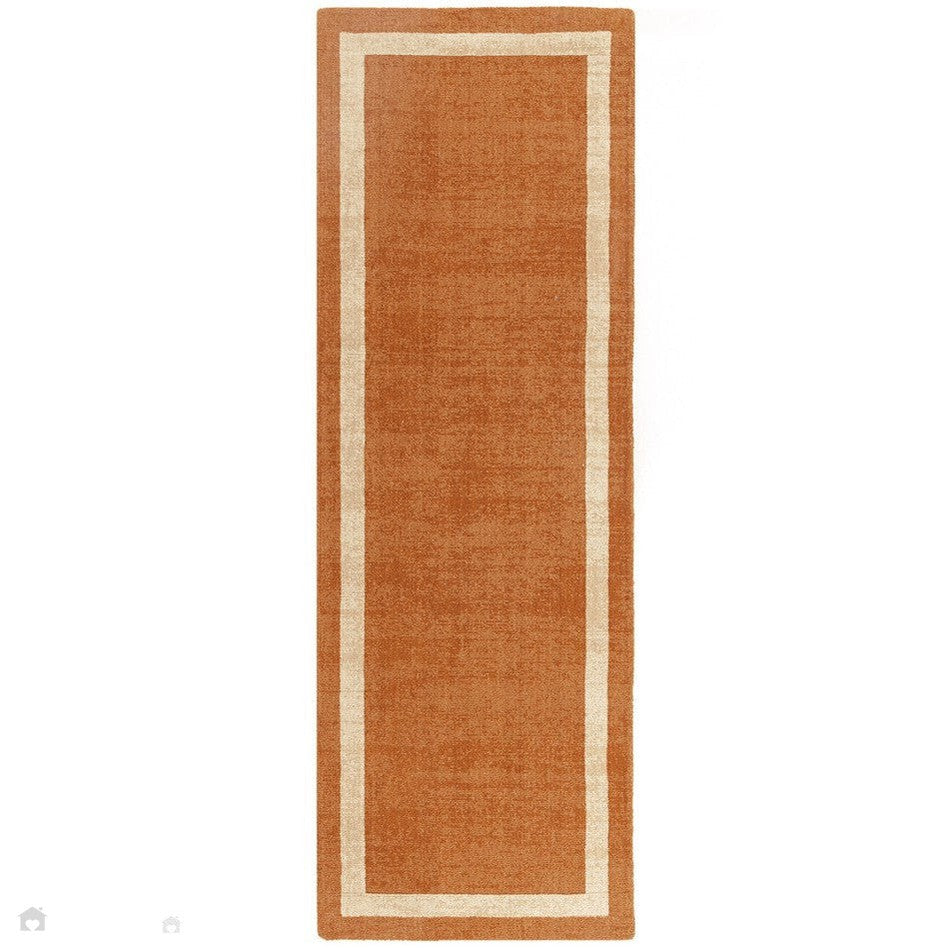 The Albi Modern Plain Border Rug in Orange brings warmth and contemporary sophistication to your interior. Its rich burnt orange base is beautifully framed by a contrasting beige border, creating a clean, tailored aesthetic that balances vibrancy with refinement.