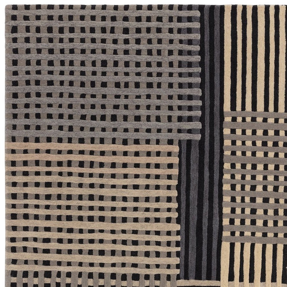 Its interlocking basketweave pattern blends soft and deep greys with warm beige and ivory tones, creating a harmonious geometric composition that suits both contemporary and classic interiors. The space-dyed wool fibres introduce natural tonal variations, ensuring that each rug is unique, while the hi-low tufted surface enhances the sense of texture and depth.