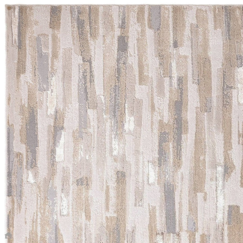 The Aurora AU25 Impression Rug layers linear abstract strokes with shimmering highlights, creating a refined, contemporary surface full of depth and movement. The palette of Grey, Beige, Gold shimmer, and Cream balances warmth and coolness, offering versatility across different interiors. Crafted from a polyester and polypropylene blend with an 8mm low-profile cut pile, it is durable, soft, and easy to care for. With its lustrous finish and textured artistry, the Impression Rug is a stylish statement piece that enhances both modern and transitional homes.