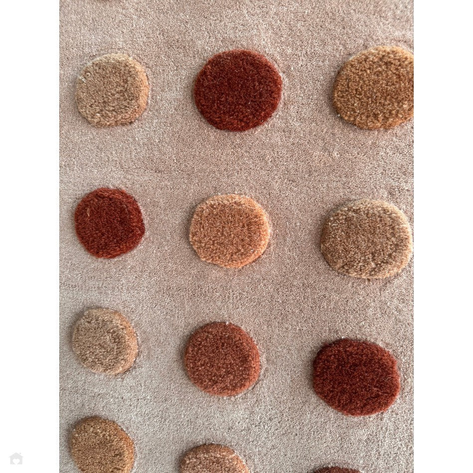 The Dotty Modern Geometric Polka Dot Hand-Carved Hi-Low 3D Dome Wool & Viscose Rug in Natural combines Beige, Light Sand, Burnt Orange, Terracotta, Golden Ochre, and Deep Rust in a harmonious mix of warm, natural tones. Its 176 individually hand-carved viscose domes create a distinctive 3D surface, while the interplay between the matte wool base and lustrous viscose accents delivers dynamic texture and subtle light reflection.