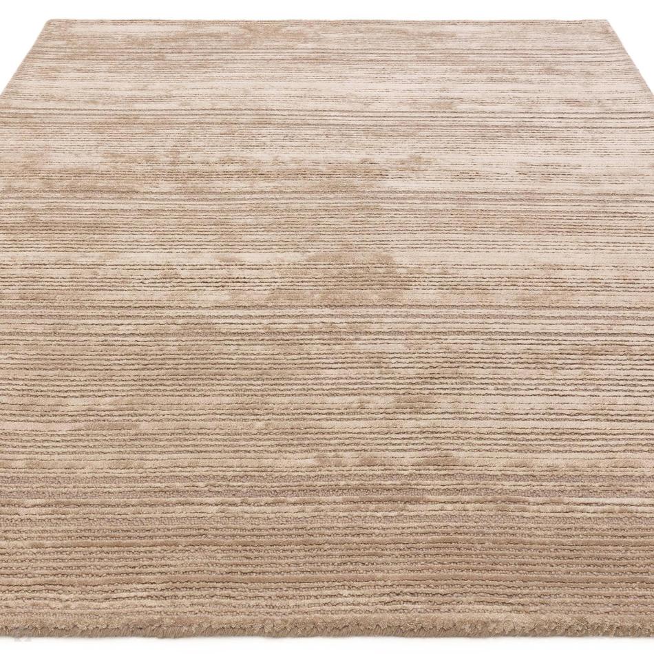 The Henley Sand Beige/Taupe/Stone/Ivory Rug offers a modern linear design that plays gently with light through its hi-low cut-and-loop texture. The blend of Sand Beige, Taupe, Stone, and Ivory Mist produces a balanced, tonal palette that suits both classic and contemporary interiors. Crafted from a luxurious wool and viscose blend, this 10mm pile rug is both durable and soft, exuding understated refinement. Its viscose highlights subtly catch the light to create natural tonal variation, while the looped wool base adds structure and tactility. The result is a soothing, elegant finish ideal for living rooms, bedrooms, and neutral-toned spaces, complementing natural woods, linens, and soft metallic décor.