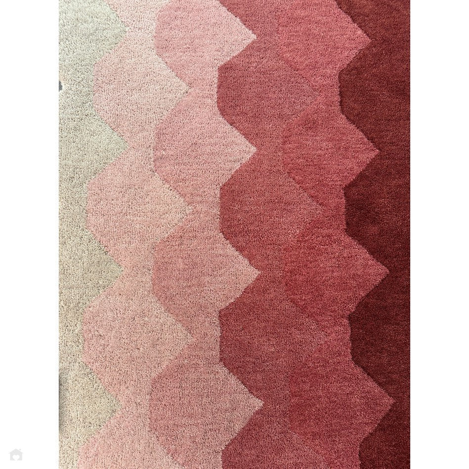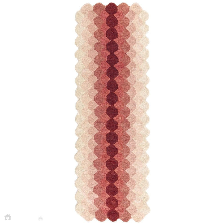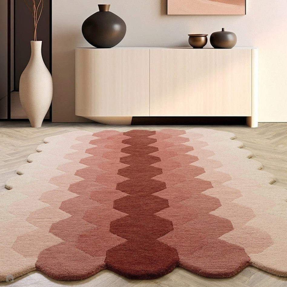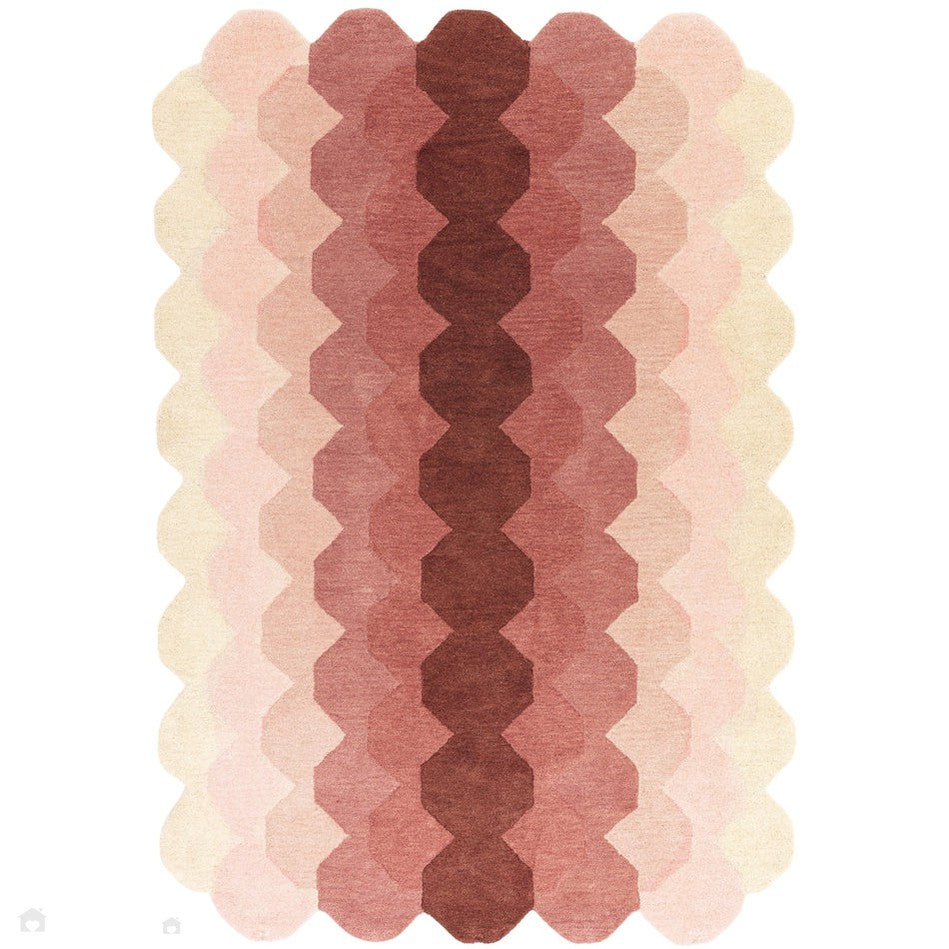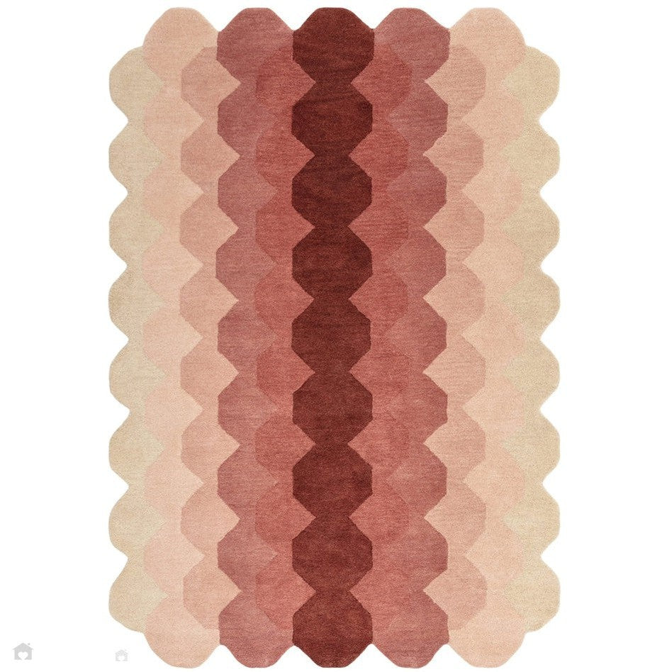 The Hive Pink & Burgundy Rug blends Deep Burgundy, Rosewood Red, Blush Pink, Dusty Rose, Powder Pink, and Cream into a striking hexagonal gradient design that flows seamlessly from dark to light. Hand-tufted in India from 100% pure wool, this rug offers a luxuriously soft feel with an 8mm low-profile short pile that is practical yet stylish. The scalloped edges enhance the contemporary appeal, making it perfect for bedrooms, living rooms, and romantic or modern interiors where soft, warm tones create a cosy, inviting atmosphere. Its rich gradient effect brings depth, movement, and a touch of sophistication to any space.