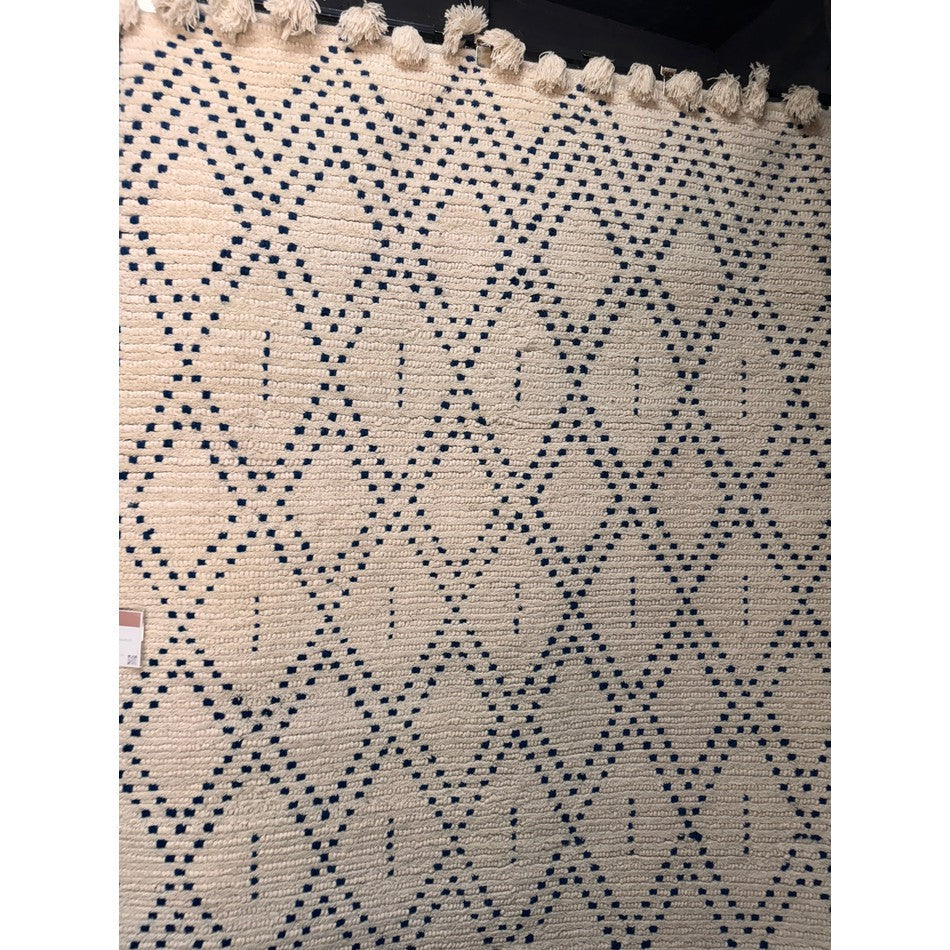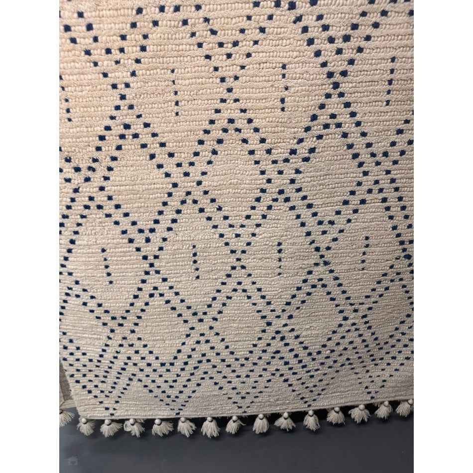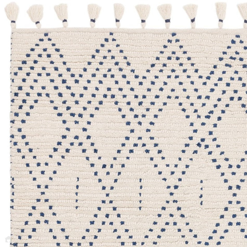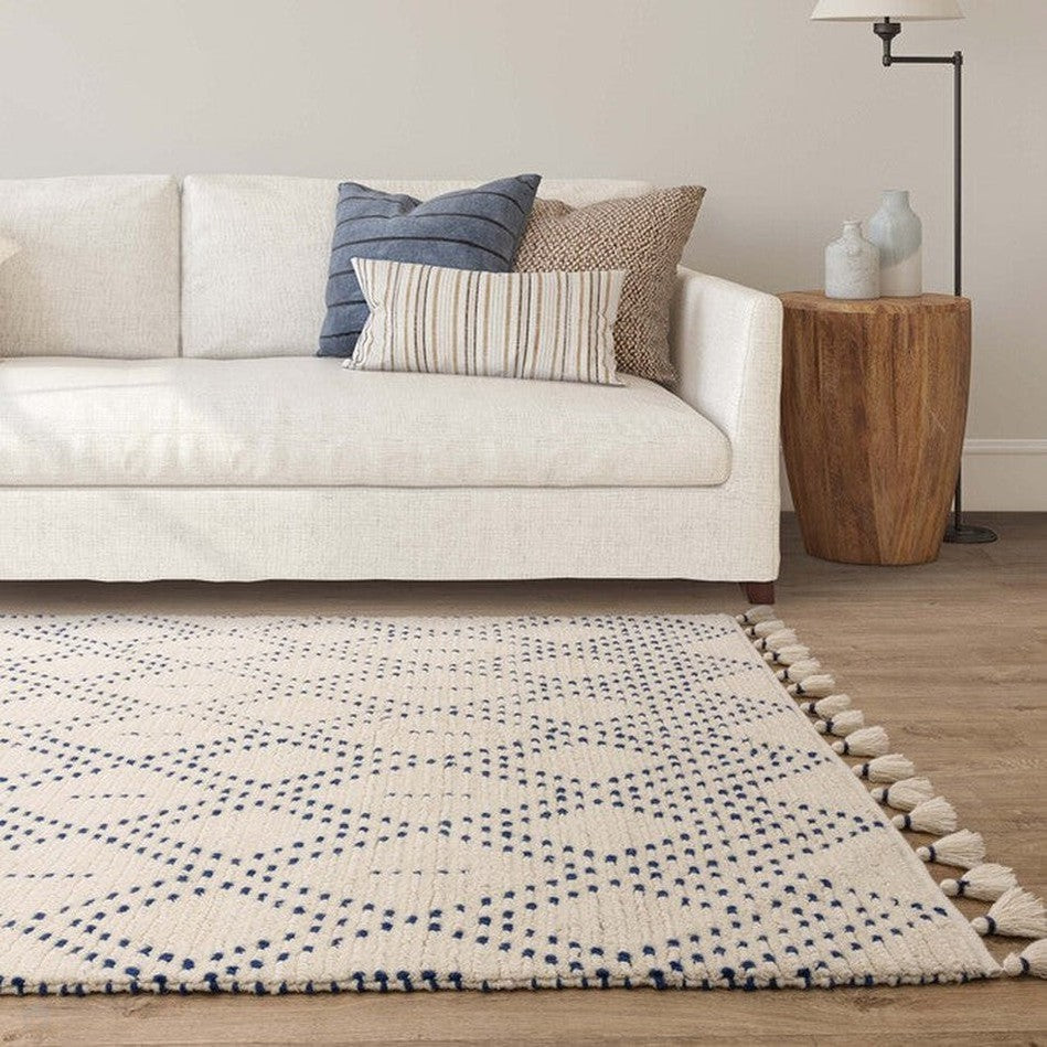 The Nepal Diamond Cream/Blue Rug beautifully merges handcrafted tradition with modern Moroccan-inspired design, offering an elegant yet organic look. Hand-woven in India from 100% wool, it features a 10mm low flatweave pile with a ribbed, looped texture for depth and tactile softness. The diamond Berber pattern in deep blue stands out against the warm cream background, while tasselled edges add artisanal character. Its naturally soft wool fibres and neutral tones make it an ideal choice for Scandi, bohemian, and contemporary interiors.