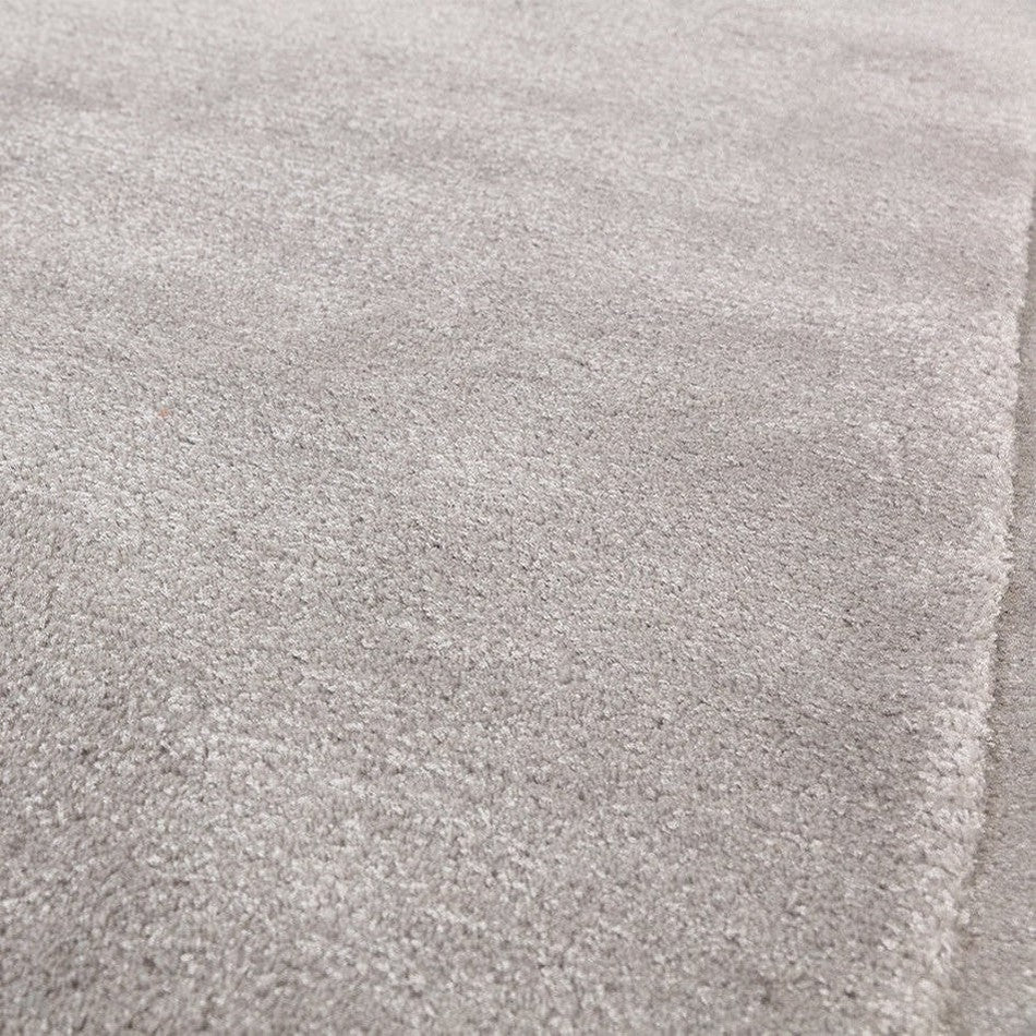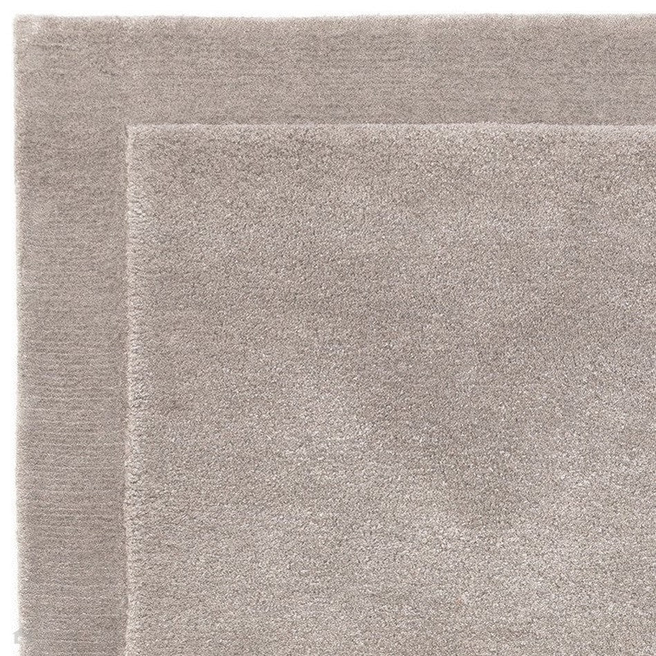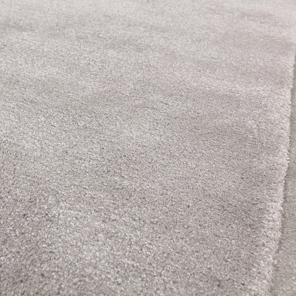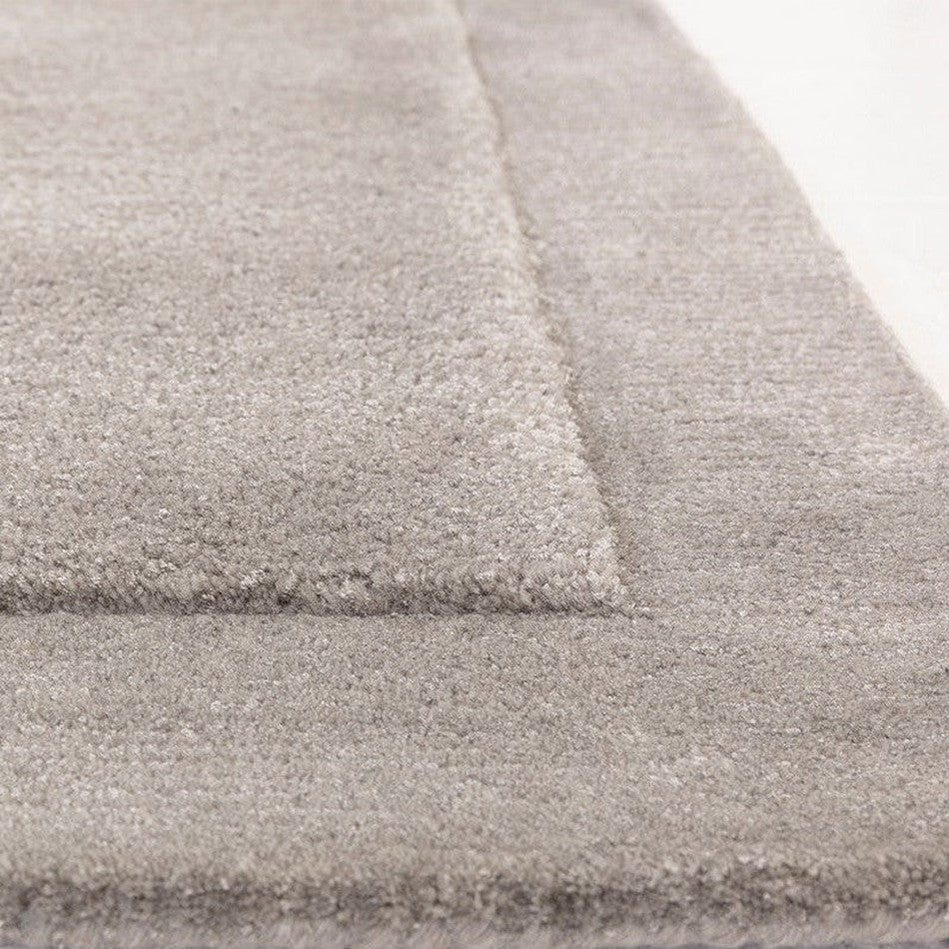 The Rise Modern Plain Border Tonal Silver Rug exudes understated sophistication and modern elegance. Hand-tufted in India from a luxurious blend of 58% wool and 42% viscose, it perfectly combines the soft durability of wool with the lustrous sheen of viscose. The hand-carved low-pile border frames a subtly raised central field, producing a refined hi-low texture that enhances the rug’s minimalistic beauty and tactile appeal. Its high-density heavyweight construction with a 10–15 mm pile height delivers a plush, substantial feel underfoot while maintaining excellent structural integrity.