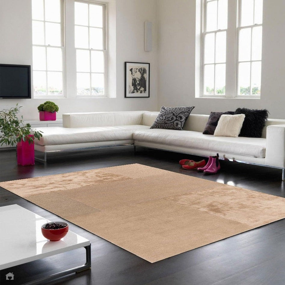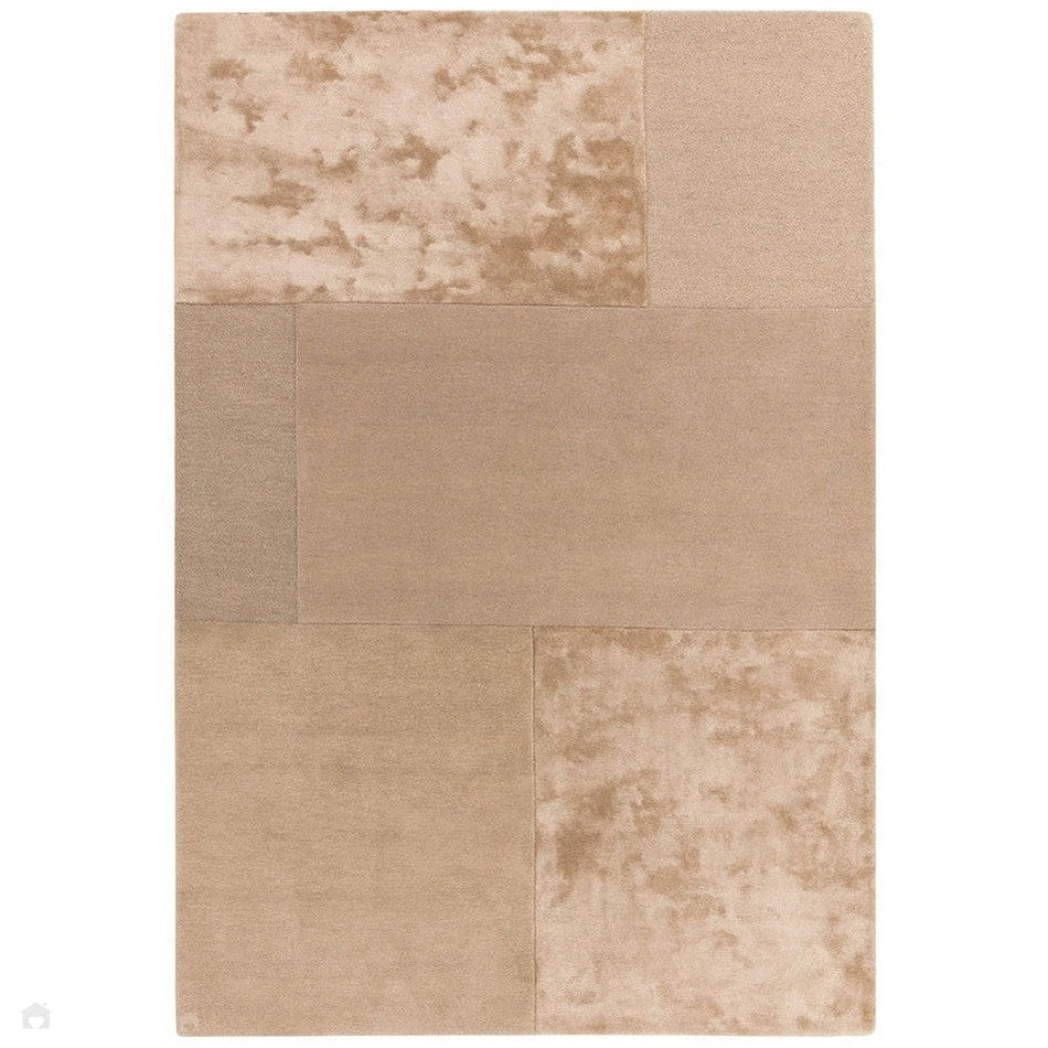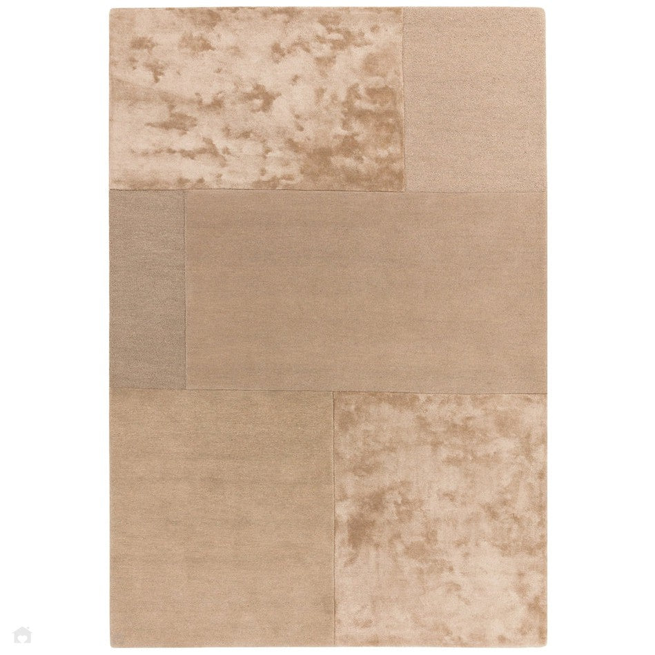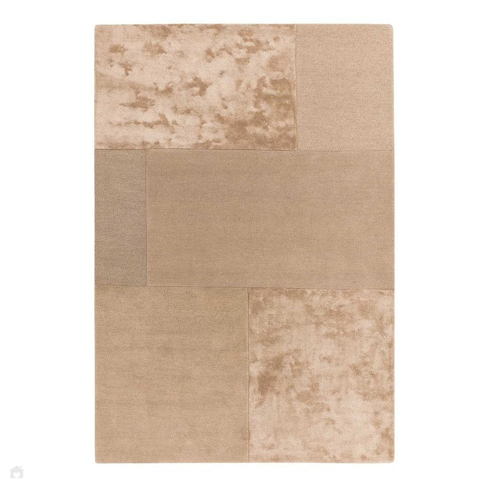 The Tate Sand Rug exudes warmth and natural elegance through its beautifully balanced composition of texture and tone. Expertly handmade in India from a premium 60% wool and 40% viscose blend, this rug features a 10 mm high-density pile with precision hand-carved detailing that accentuates its geometric layout. The design combines soft matte wool sections with lustrous viscose panels, creating a modern patchwork that shifts subtly under changing light.