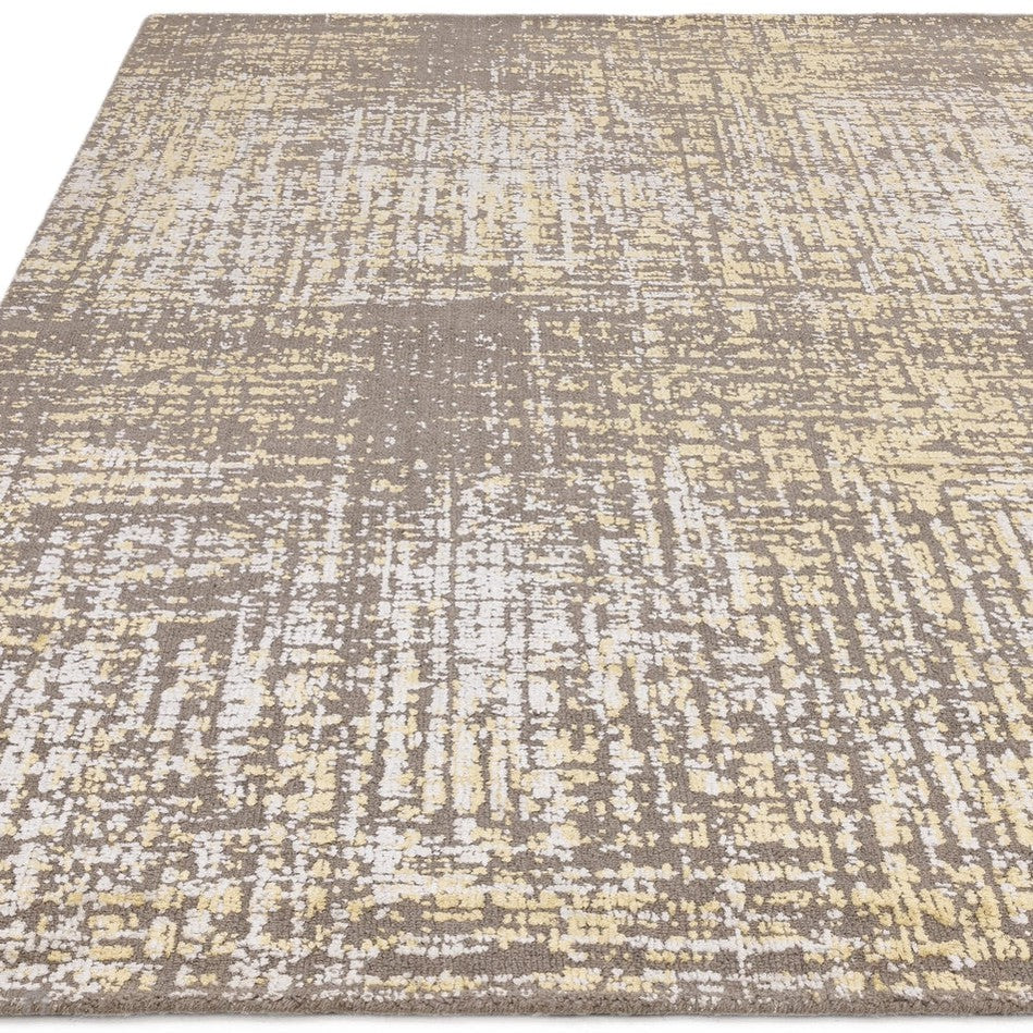 Introducing the Torino Modern Abstract Distressed Shimmer Rug in Gold/Yellow/Beige – a radiant and luxurious addition to your interior, designed to bring warmth, texture, and sophistication to any space. Expertly crafted in India from a premium 50% wool and 50% viscose blend, this rug combines soft wool loop pile with shimmering cut-pile viscose to create a hi-low surface with exceptional depth. The 5–10mm pile height adds subtle dimension and a tactile, inviting feel underfoot. The distressed abstract design is enhanced by the natural sheen of the viscose, which beautifully catches the light, adding a refined elegance. This warm colourway blends gold, mustard yellow, beige, and taupe grey into a layered tonal composition that feels rich yet balanced – perfect for creating a cosy, inviting atmosphere in living rooms, bedrooms, or dining areas. Its mix of earthy and opulent tones makes it a versatile statement piece for both neutral and richly coloured interiors.