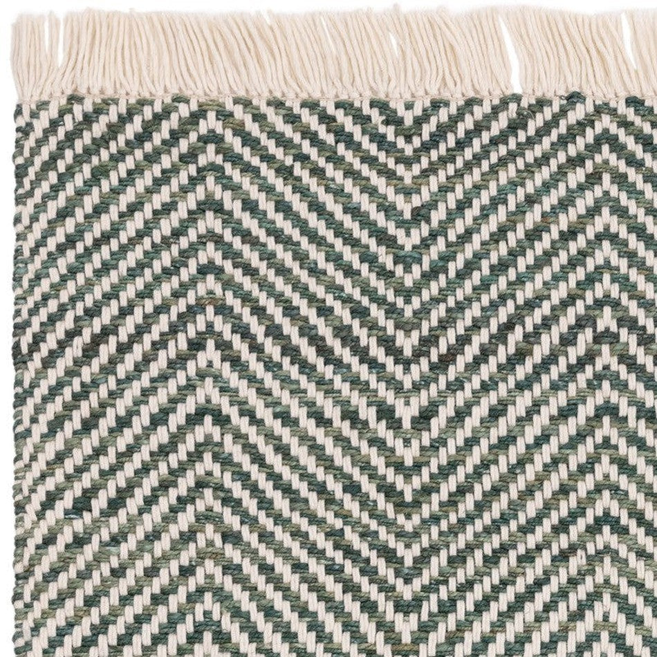 The Vigo Green/Cream Rug brings an earthy yet refreshing feel to your interior, combining natural textures with a modern boho aesthetic. Handwoven in India by skilled artisans, this rug features a striking chevron zig-zag pattern created from a durable blend of jute and wool, offering a soft yet hardwearing finish underfoot. The thick yarns are gently dyed to achieve subtle tonal variations in green and cream, adding depth and dimension to the design. The soft cream fringe detail at each end completes the look with an artisanal touch. Thanks to its chunky flatweave construction, the Vigo rug is Versatile, flexible, and offers a slight stretch, making it ideal for areas where free movement and practicality are key.