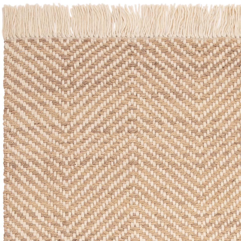 The Vigo Sand/Cream Rug showcases a modern chevron-inspired design, with a harmonious blend of Sand Beige, Natural Cream, and Light Taupe tones. Its handwoven jute and cotton construction offers a soft yet hard-wearing flatweave texture, making it perfect for living rooms, bedrooms, or hallways. The ivory fringe detailing elevates the design with a boho touch, while the natural materials and neutral palette ensure versatility and timeless appeal.