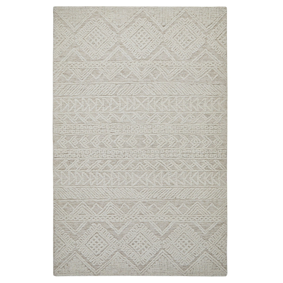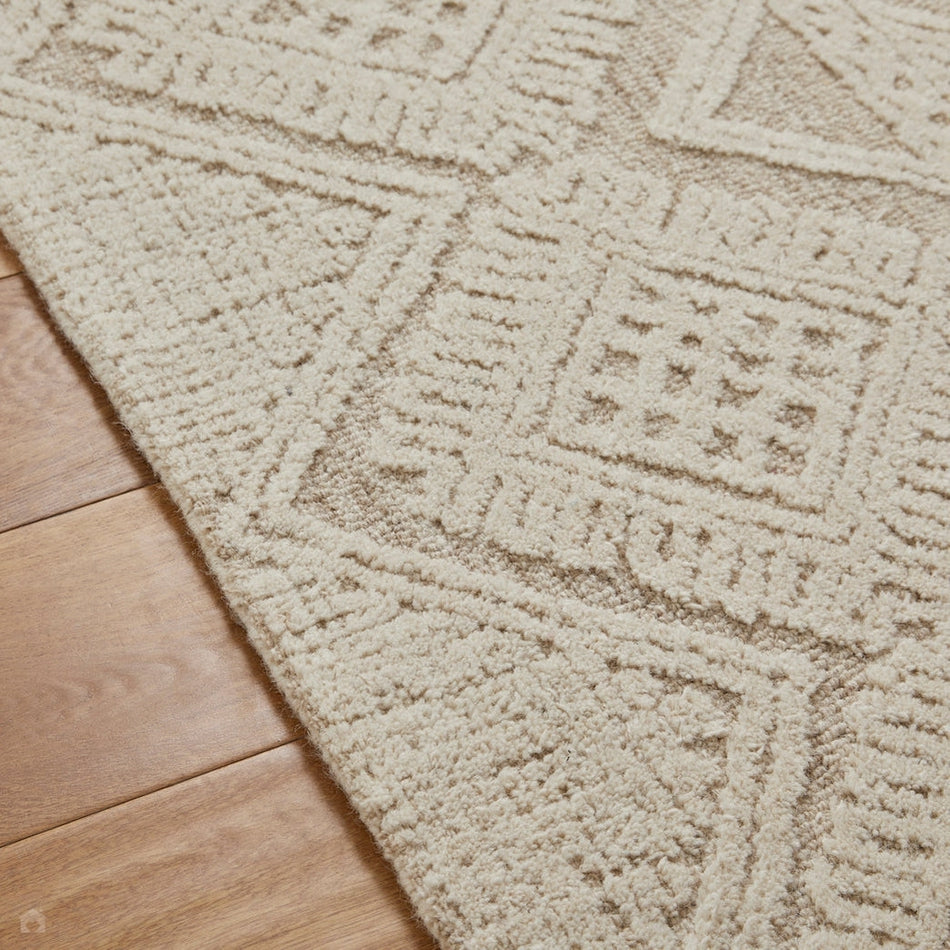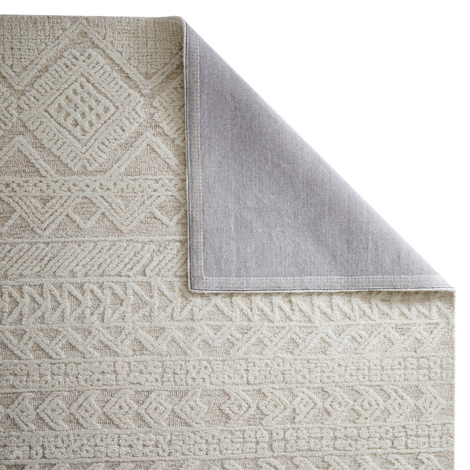 This hand-woven rug is crafted with a textured wool loop pile, offering a sophisticated blend of Warm Beige, Soft Ivory, Muted Taupe, and Off-White tones. The raised ivory detailing contrasts against the woven base, creating a tactile, dimensional effect. Its geometric design and natural colour palette make it a versatile statement piece, perfect for both modern and rustic interiors.