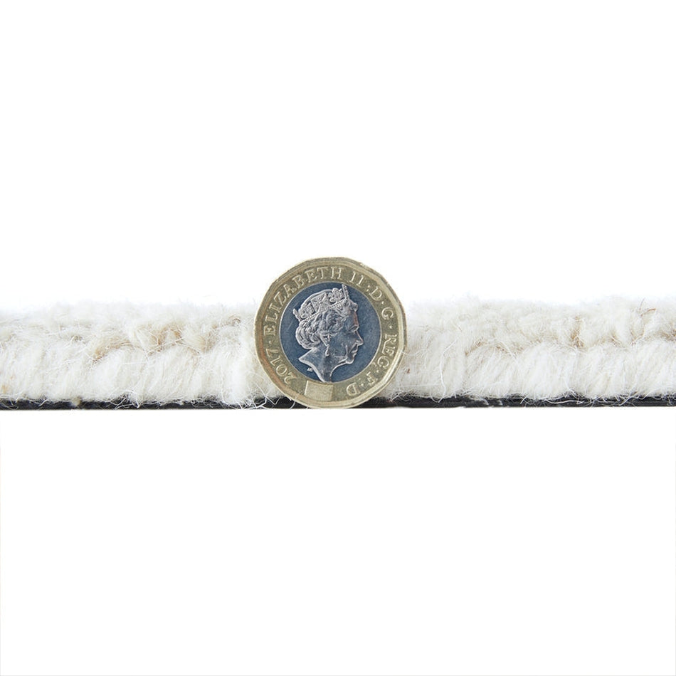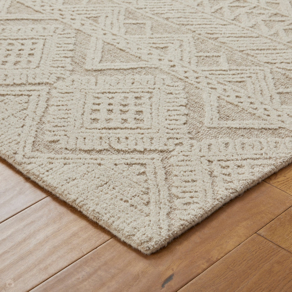 - Soft Ivory – Raised, textured loop pile forming intricate geometric patterns, adding a distinct contrast against the Warm Beige base while providing depth and dimension.