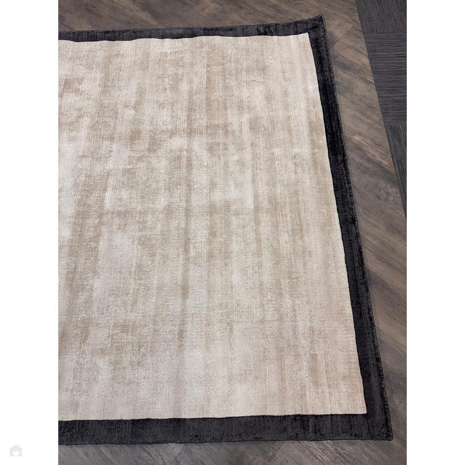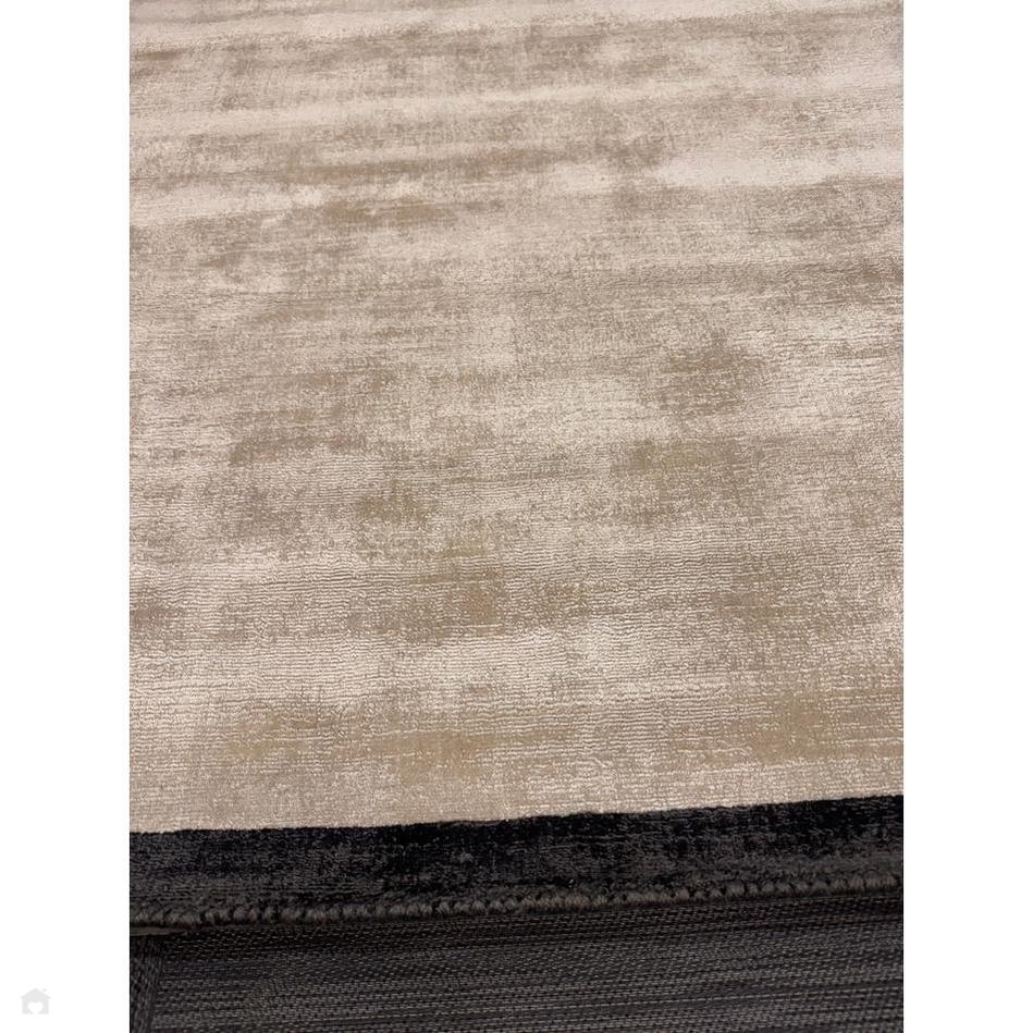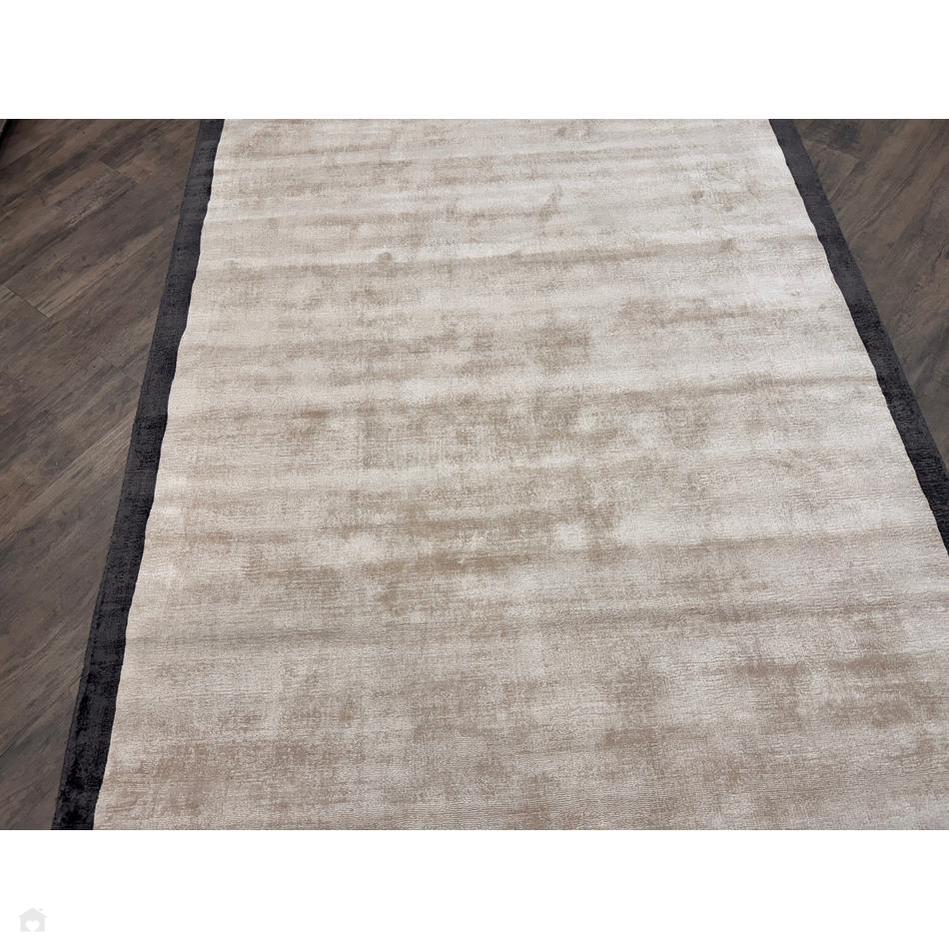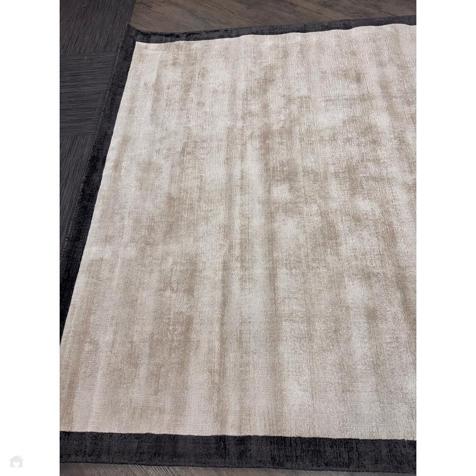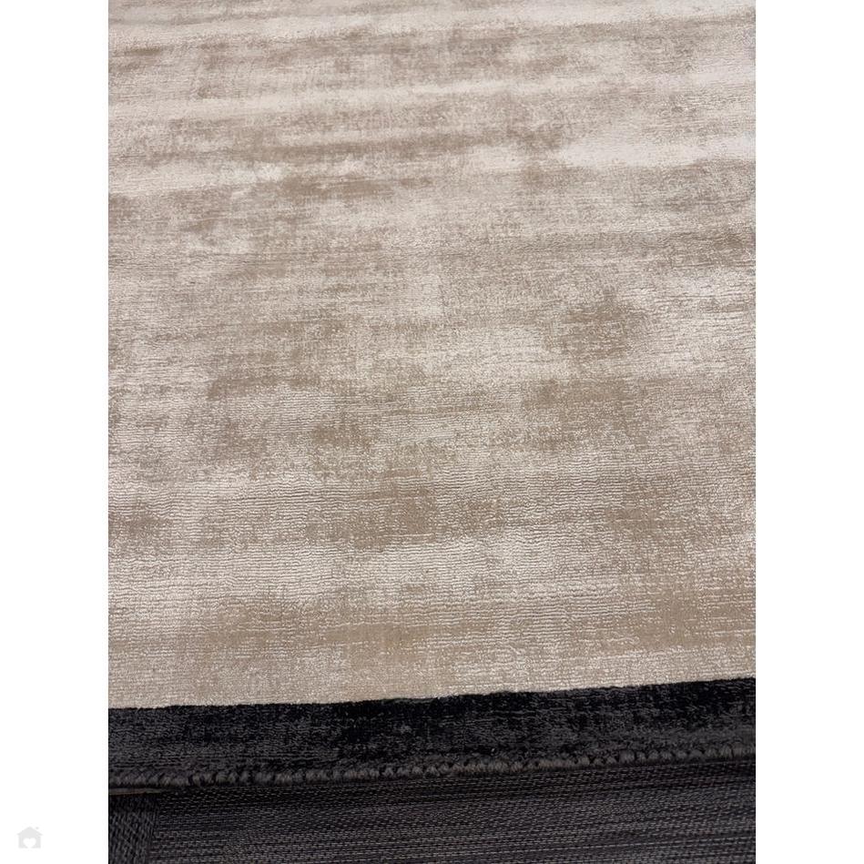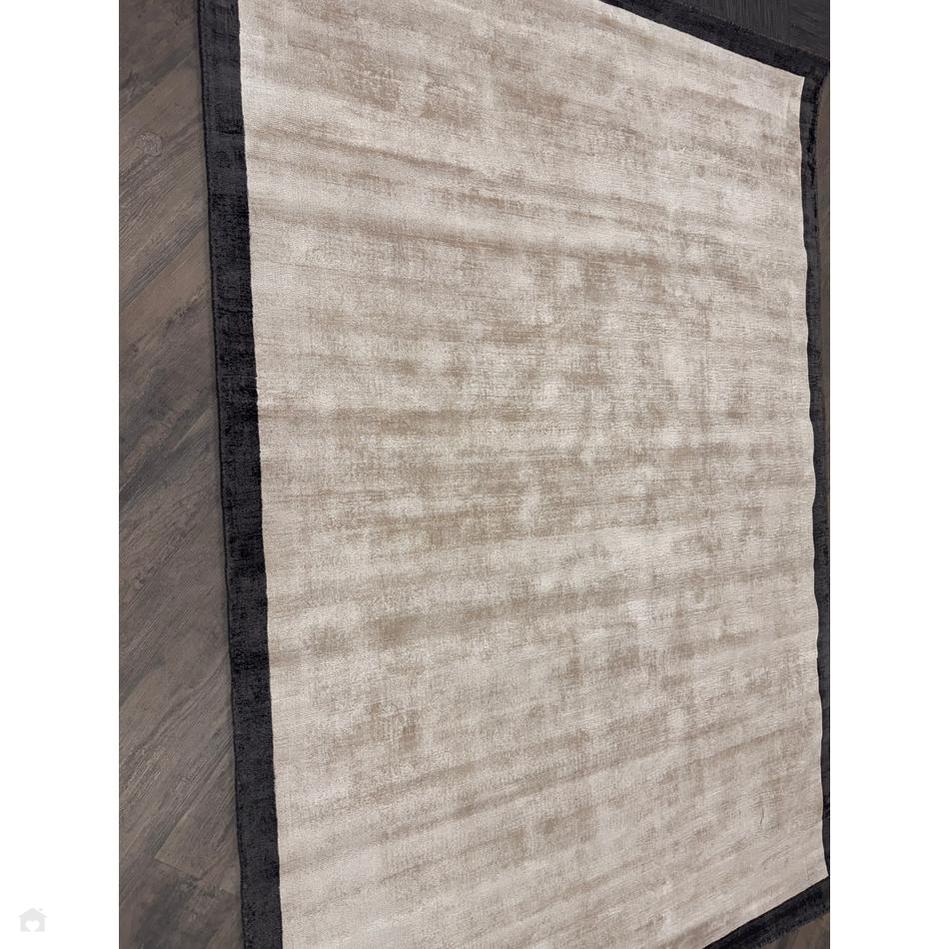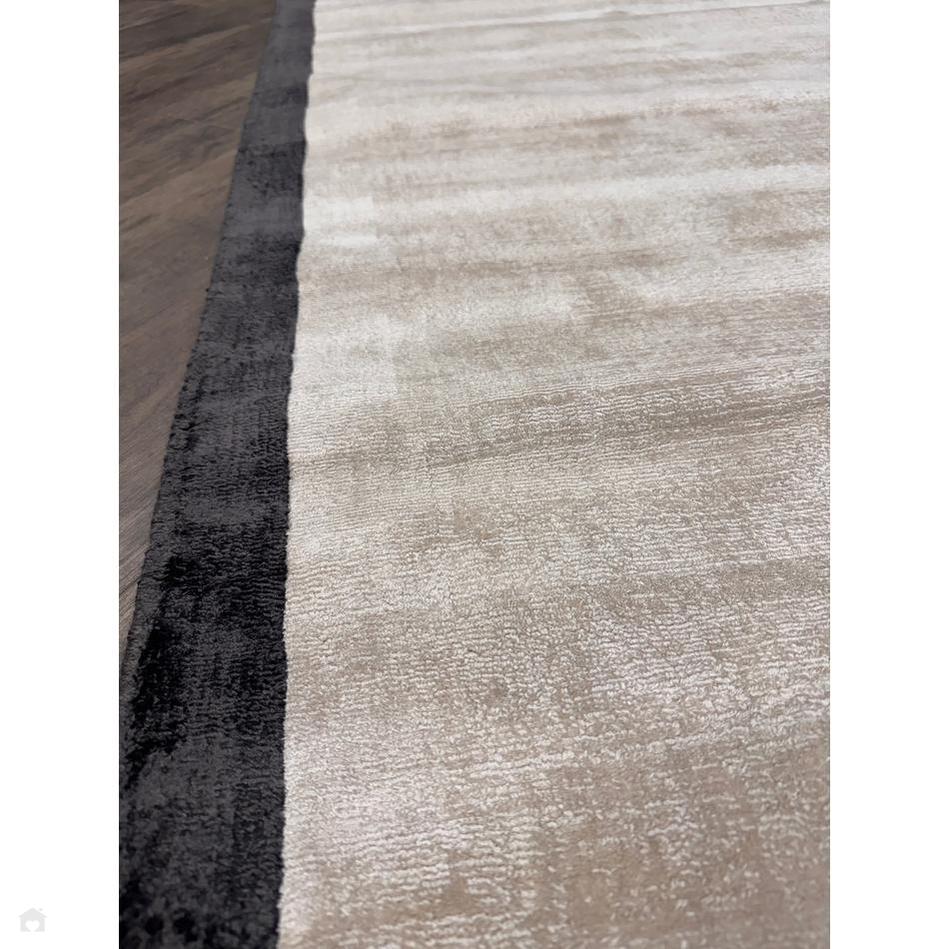 The Blade Slim Border Putty/Charcoal Border Rug layers Putty Beige, Stone Beige, Ivory, and Taupe within a shimmering centre, framed by bold Charcoal Grey and Shadowed Mocha. Crafted from 100% viscose with a tip-sheared finish and a 7mm flatweave pile, it offers a sleek profile with a silky-soft touch. The light-responsive sheen creates dynamic tonal shifts, making this rug a statement of refined elegance suitable for both modern and classic décor.