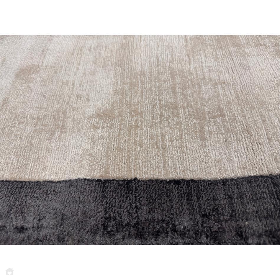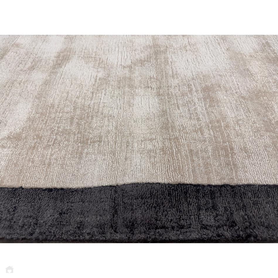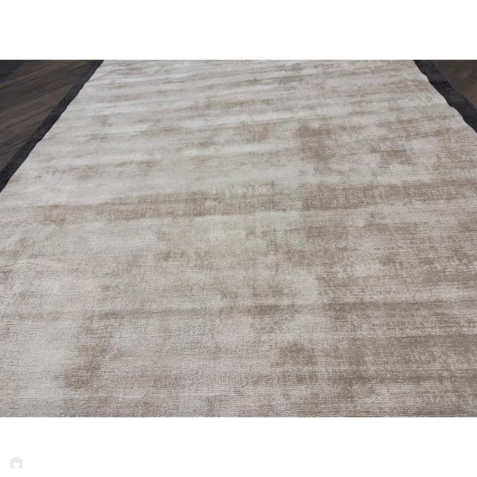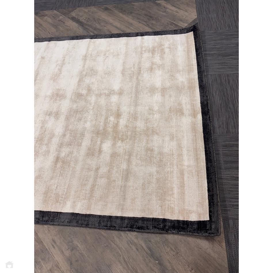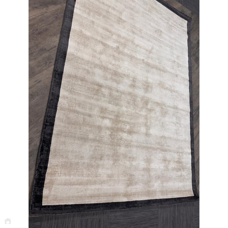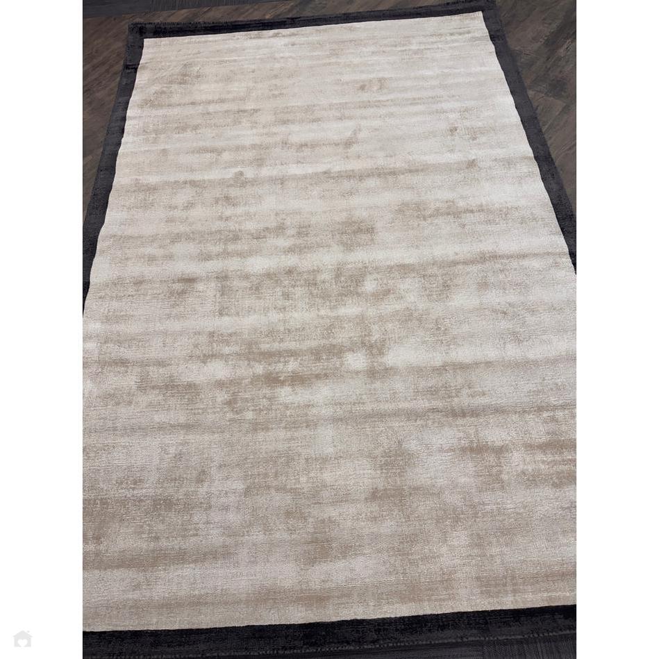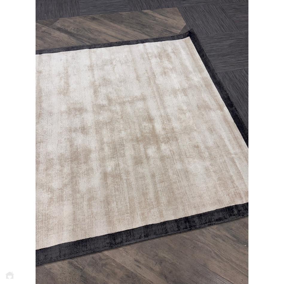 The Blade Slim Border Putty/Charcoal Border Rug layers Putty Beige, Stone Beige, Ivory, and Taupe within a shimmering centre, framed by bold Charcoal Grey and Shadowed Mocha. Crafted from 100% viscose with a tip-sheared finish and a 7mm flatweave pile, it offers a sleek profile with a silky-soft touch. The light-responsive sheen creates dynamic tonal shifts, making this rug a statement of refined elegance suitable for both modern and classic décor.