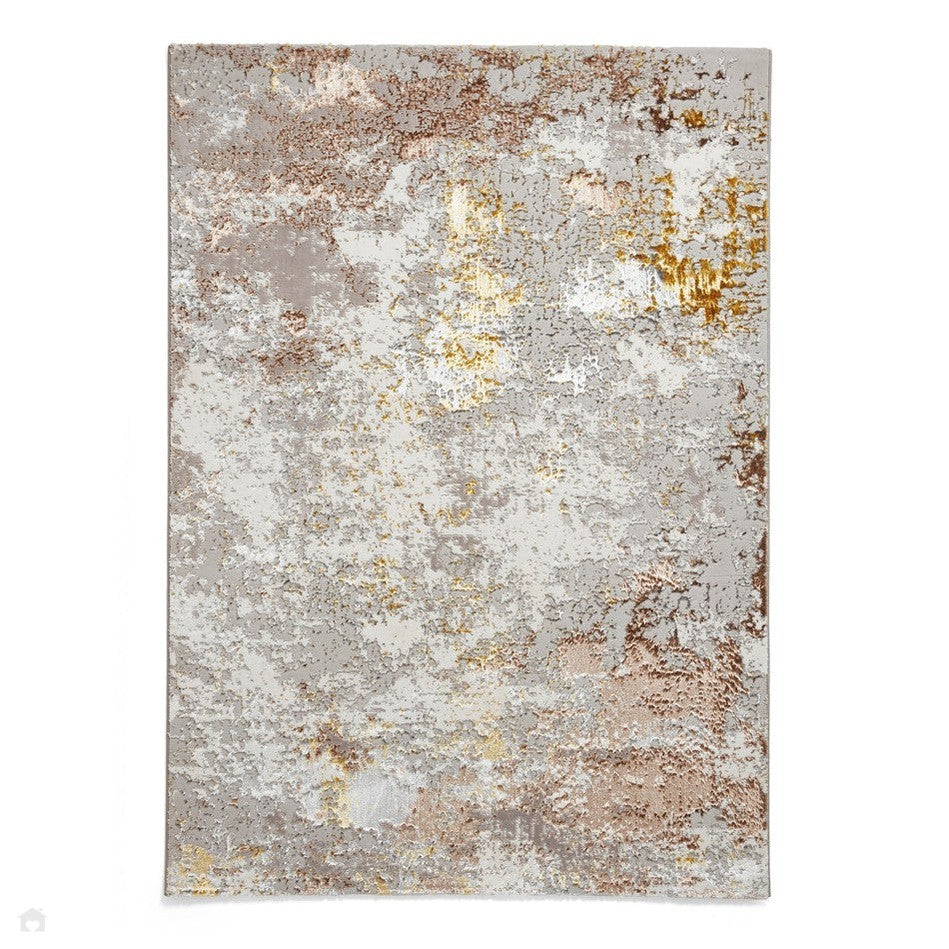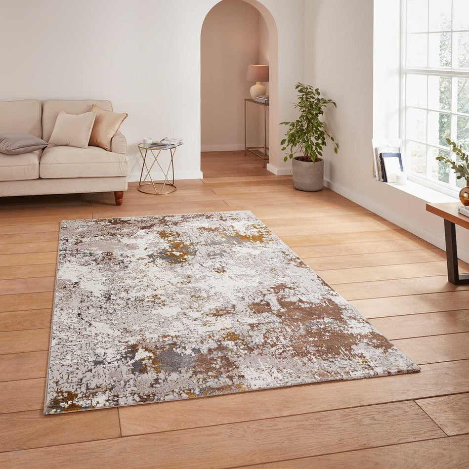 The abstract distressed design evokes a painterly, marbled effect, blending layers of Beige, Gold and Taupe with subtle metallic undertones. Light-catching highlights and intricate shading add depth and sophistication, creating a statement piece that transitions seamlessly between contemporary and classic interiors.