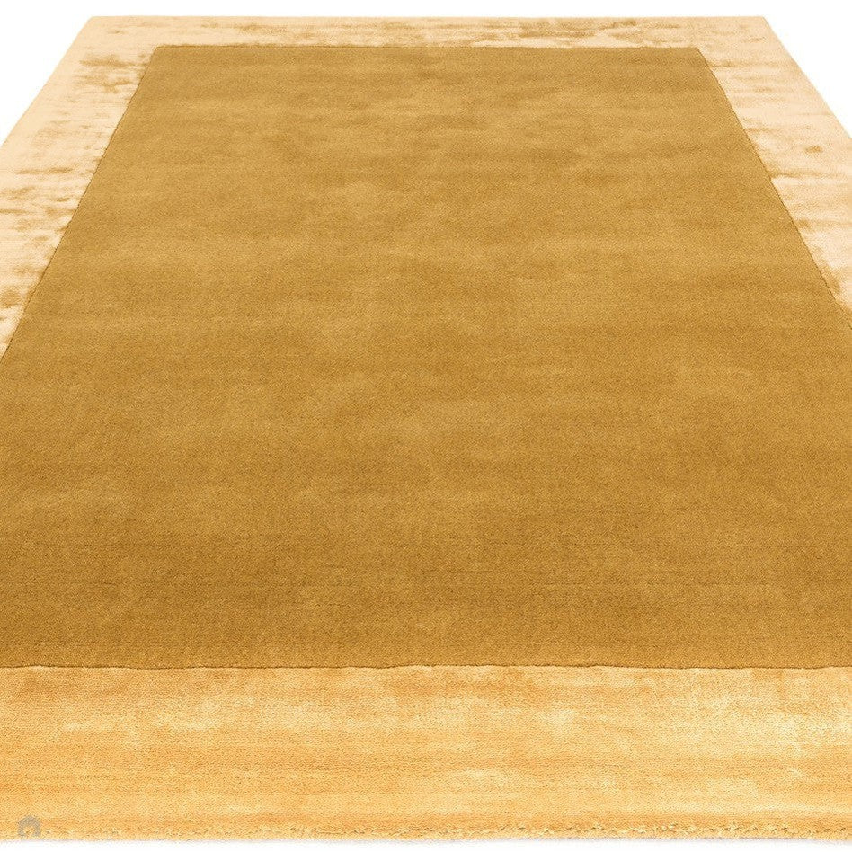 The Ascot Modern Plain Hand-Woven Wool Centred Loop Pile Metallic Shimmer Wide Viscose Border Golden Ochre/Antique Gold Rug showcases timeless design elevated by luxurious contrast. The Golden Ochre wool centre grounds the rug with natural warmth, while the Antique Gold viscose border introduces a subtle reflective finish, enhancing its contemporary charm.