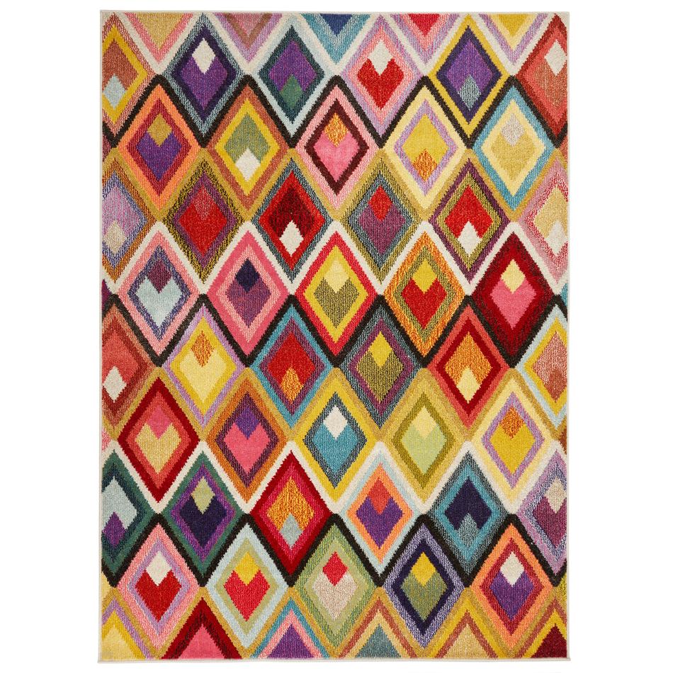The Carnaval CAR109 Multicolour Rug is a bold and expressive piece featuring a kaleidoscope of Crimson Red, Cherry Pink, Golden Yellow, Burnt Orange, Olive Green, Forest Green, Sky Blue, Teal, Deep Purple, Lavender, Ivory, and Black. Its geometric diamond pattern creates visual rhythm and excitement, perfect for adding colour and personality to living rooms, dining areas, or eclectic bedrooms. Crafted in Turkey from 100% polypropylene, With its 9mm low cut pile, machine-made construction, and jute backing, this rug is both durable and easy to care for, making it ideal for busy households. It delivers a vibrant design ideal for homes seeking colour and practicality.