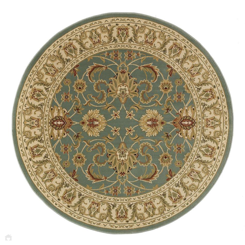 Introducing the Kendra 45L Traditional Border Round Rug in Soft Aqua Blue/Duck Egg Green & Muted Teal Green – a striking rug that blends classical elegance with a fresh, serene palette.