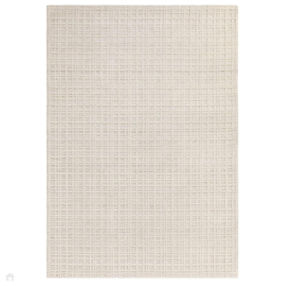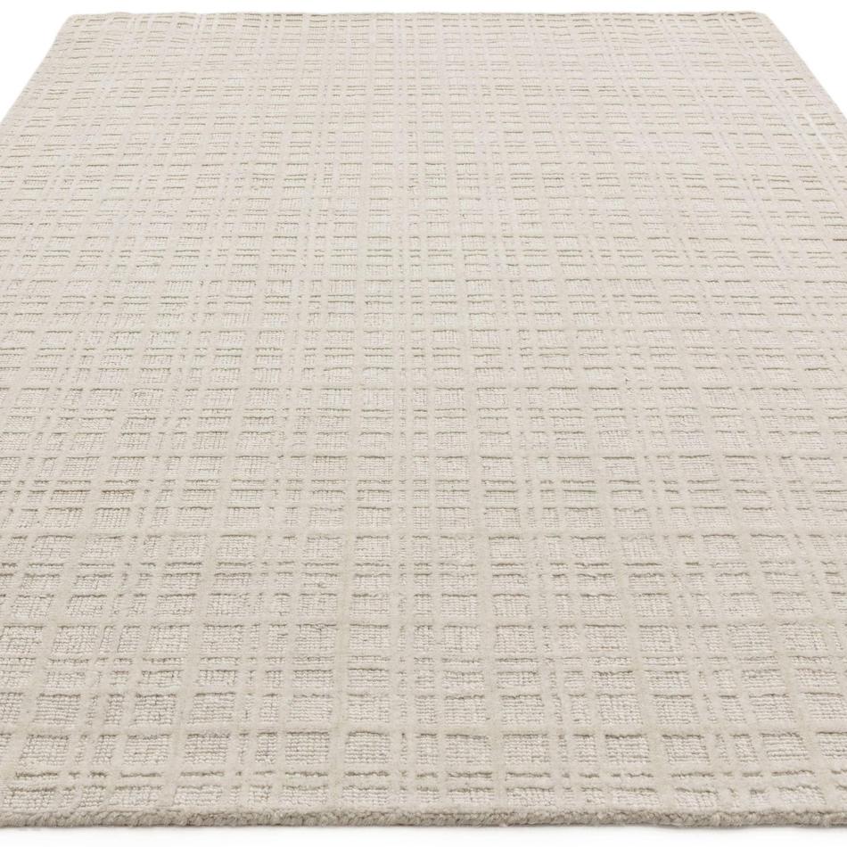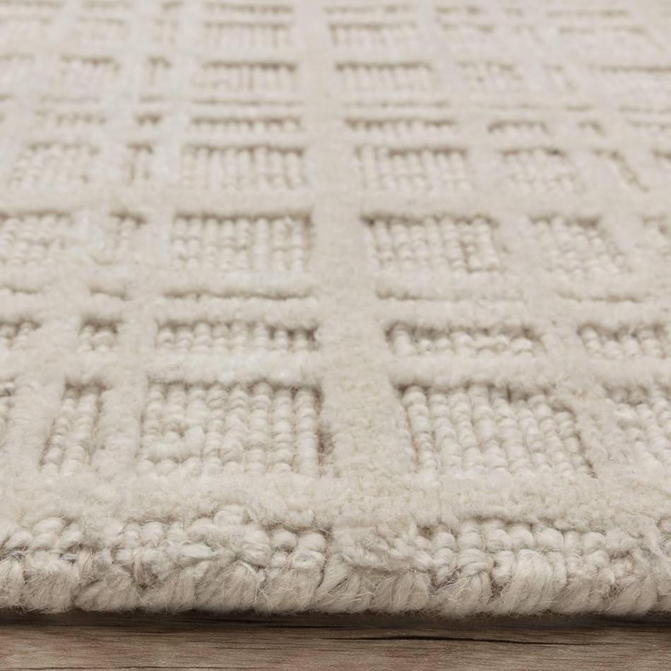 The Thatch Ecru Wool Rug is a modern geometric design hand woven in India from a blend of 72% wool and 28% polyester, featuring a 5mm high-low cut and loop pile and a cotton backing. Its ribbed loop base and cut pile overlay grid create a tactile, layered texture that brings quiet dimension to minimalist spaces. The tonal interplay of Ecru, Ivory, Natural Wool Beige, Pale Stone, and Off-White results in a soothing neutral balance ideal for living rooms, bedrooms, and light modern interiors. This rug blends artisanal craftsmanship with timeless elegance, offering both warmth and understated sophistication.