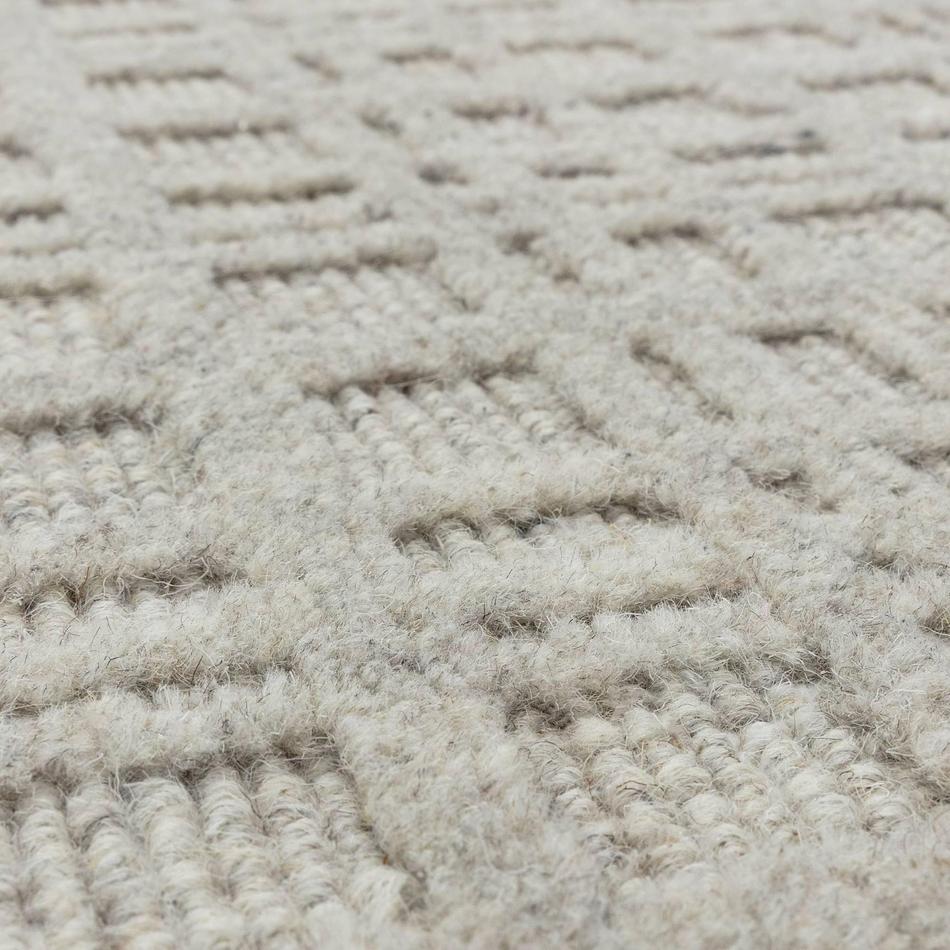 The Thatch Greige Wool Rug is a modern geometric design hand woven in India from a blend of 72% wool and 28% polyester, featuring a 5mm high-low cut and loop pile with a cotton backing. Its ribbed loop base and cut pile overlay grid create a beautifully layered, tactile texture that enhances its geometric form. The tonal mix of Greige, Warm Taupe, Stone Grey, Natural Beige, and Ivory delivers depth and versatility, blending seamlessly with both warm and cool interiors. Perfect for living rooms, bedrooms, and calm modern spaces, this rug offers a timeless balance of natural texture, understated luxury, and artisanal craftsmanship.