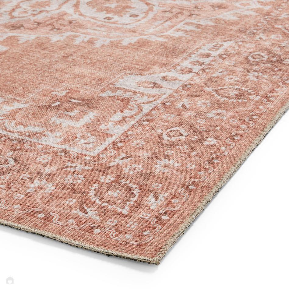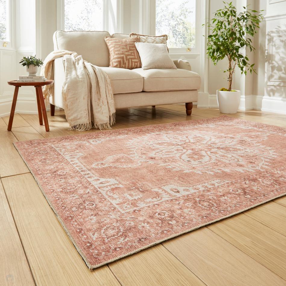 The Washable Zahra S0063 Terracotta Rug brings together heritage design and modern function with its digitally printed pattern and lightweight polyester flatweave construction. The intricate medallion and floral border design, presented in tones of Terracotta, Faded Rose, Soft Ivory, Muted Clay, and Dusty Taupe, delivers an elegant yet relaxed vintage look. With a 0.2 cm washable pile, anti-slip backing, and foldable structure, it’s perfect for high-traffic areas, family homes, and pet-friendly spaces. Combining the look of a treasured antique with the ease of contemporary maintenance, Zahra is a beautiful, low-maintenance statement piece for stylish, lived-in interiors.