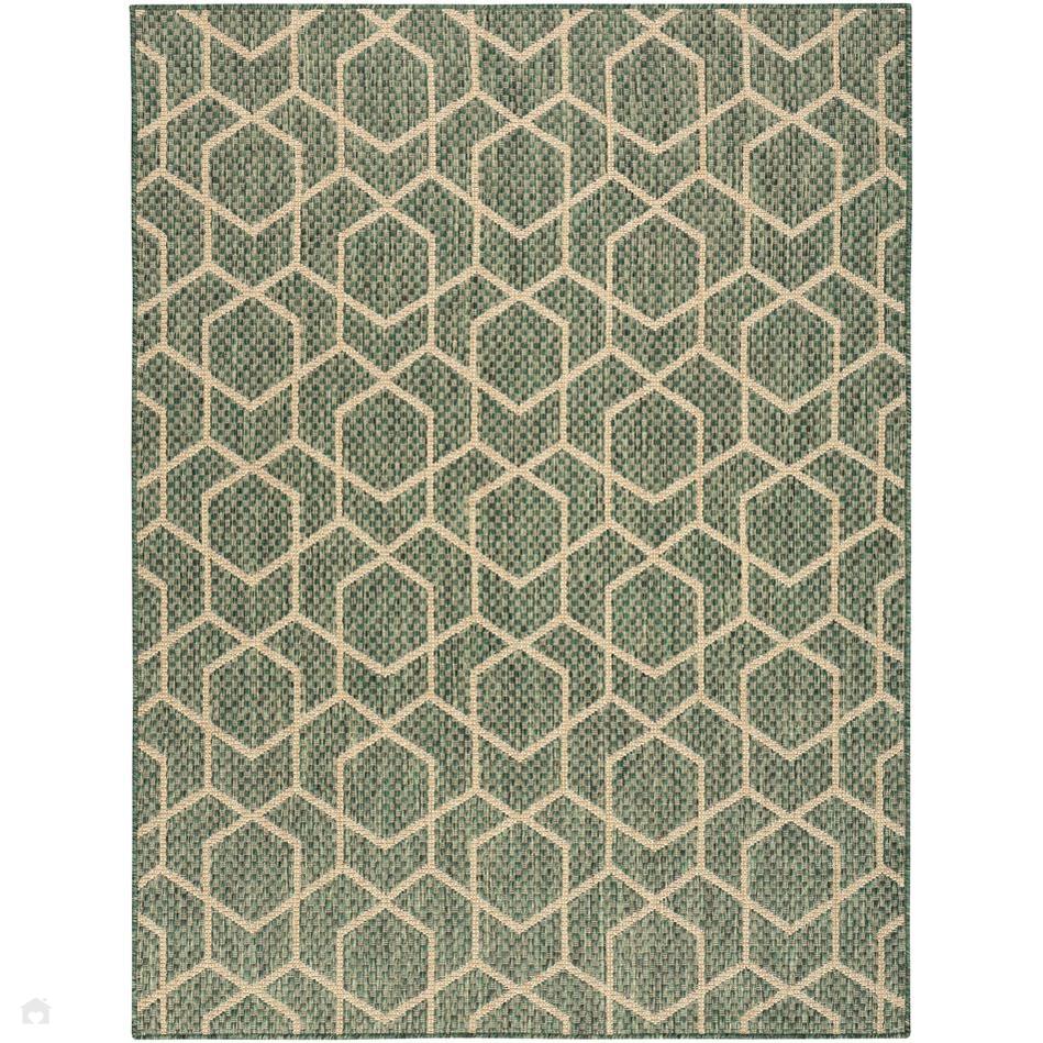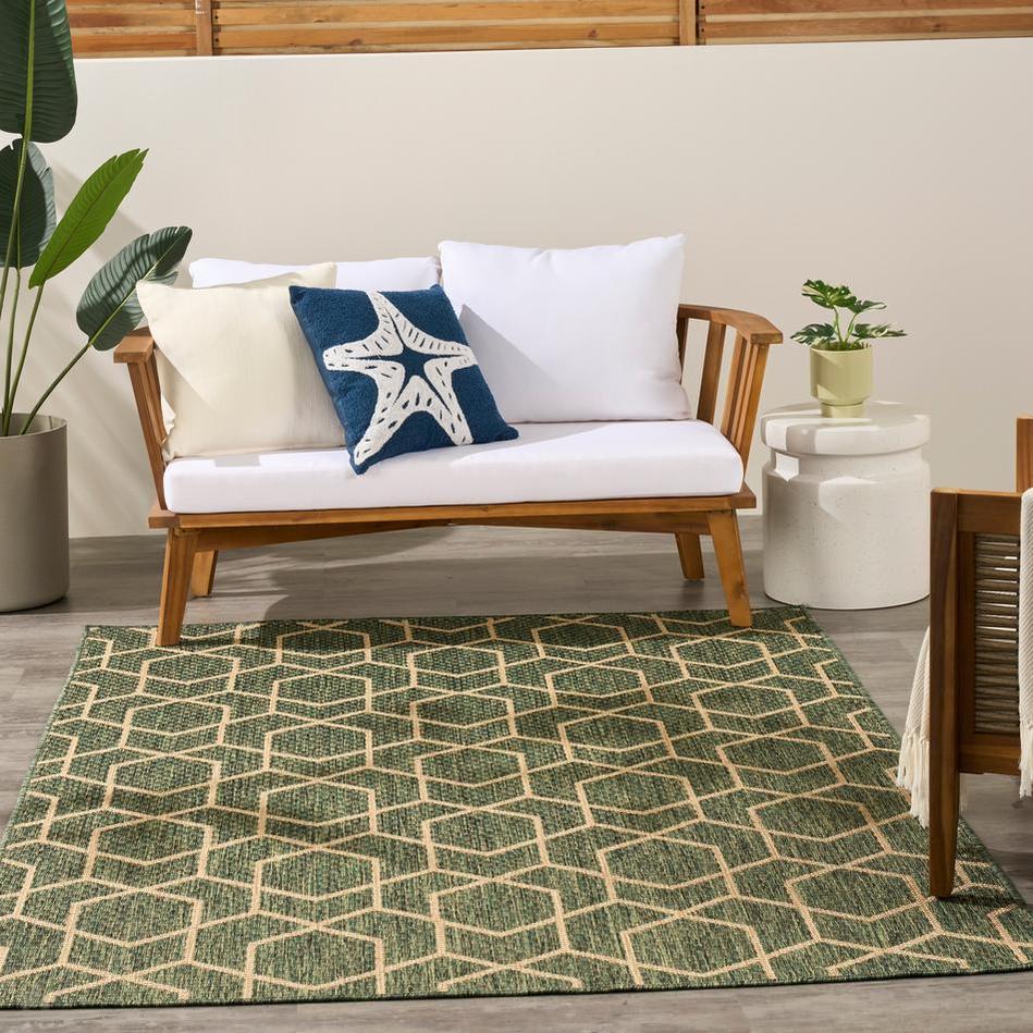 Sleek and modern, this green geometric outdoor rug from the Horizon Collection offers a contemporary take on classic design. The eye-catching pattern effortlessly complements a variety of settings from urban balconies to cozy living rooms while adding depth and visual appeal. This flatweave rug is made from a blend of polyester and polypropylene with a subtle high-low pile and tonal variations.